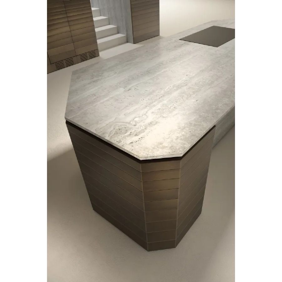 Bespoke kitchen project. Columns with niches. Equipped peninsula and prism-shaped island. Integrated Stars boiserie and door.
