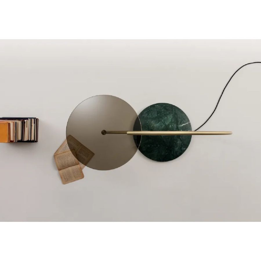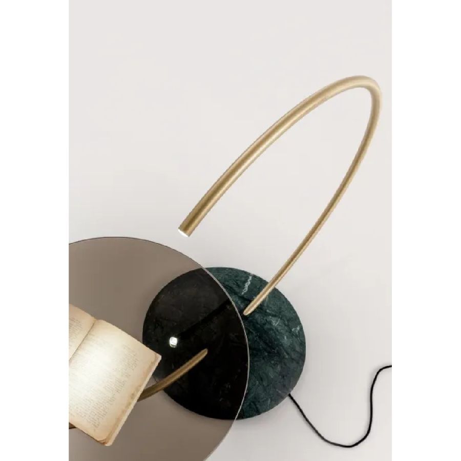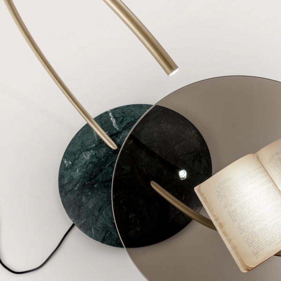 Coffee table with integrated light, satin brass structure, marble base and round bronzed glass top.
