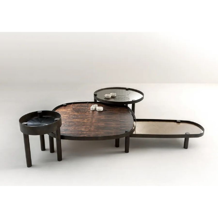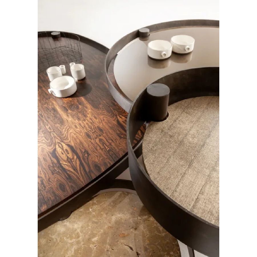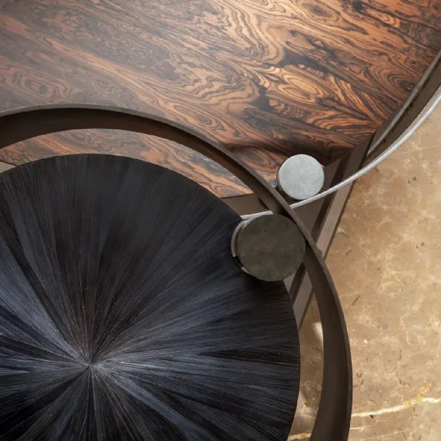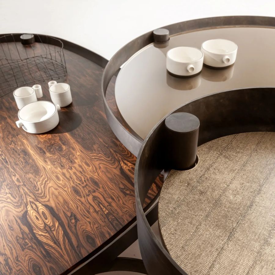 Family of coffee tables with tubular base in etched metal with a 'tray' effect, available in different shapes, designs and sizes, and customizable finishes.