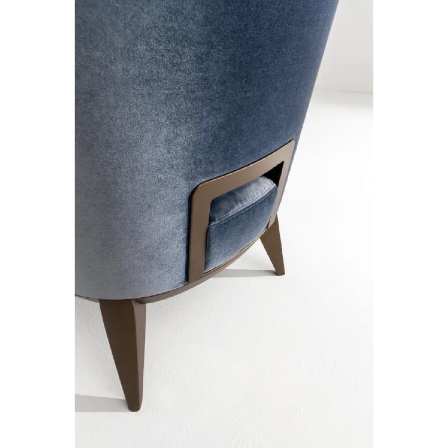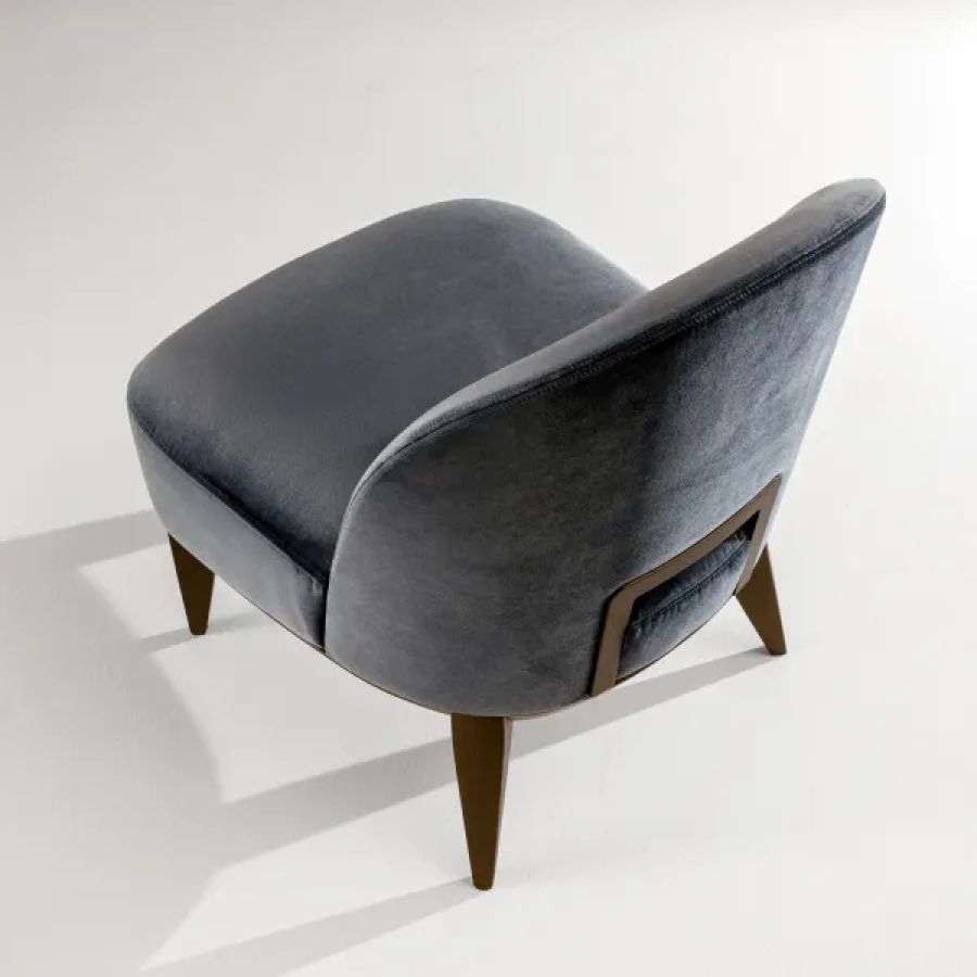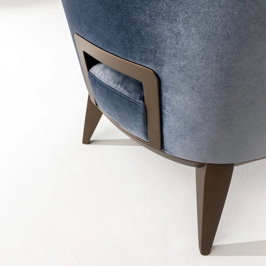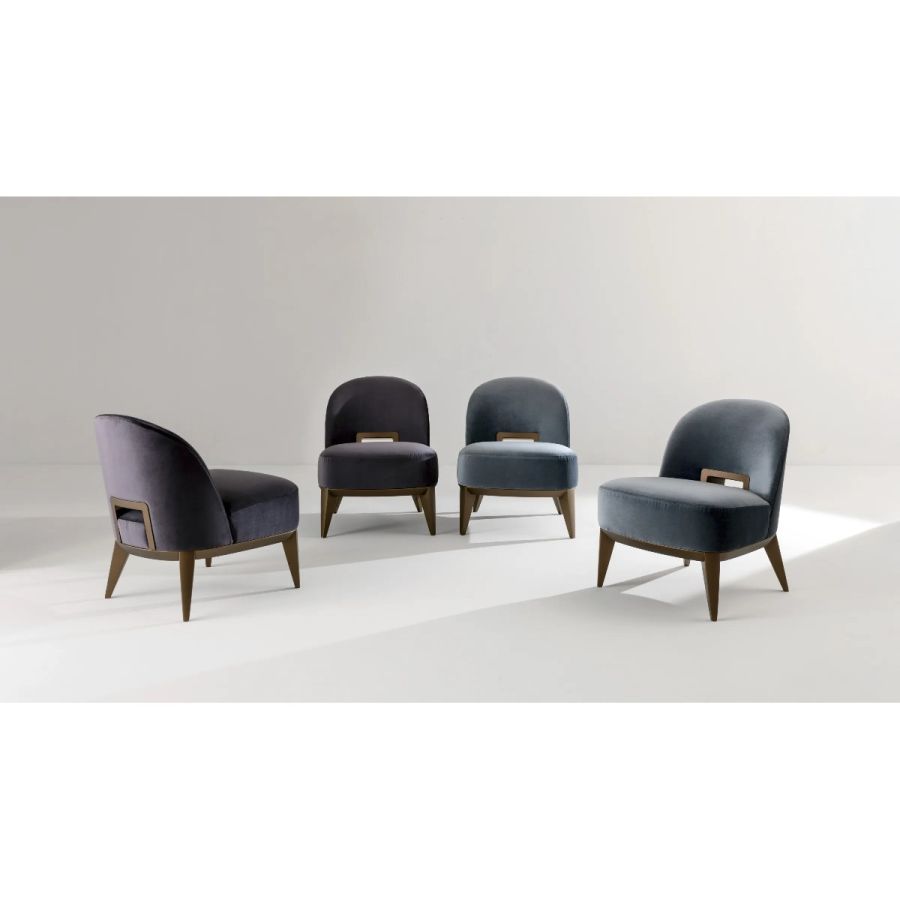 Padded armchair with wooden structure and seat in expanded polyurethane covered in leather, velvet or fabric.