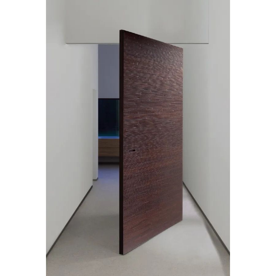 Pivot door in carved wood with horizontal or vertical Decor texture on both sides.