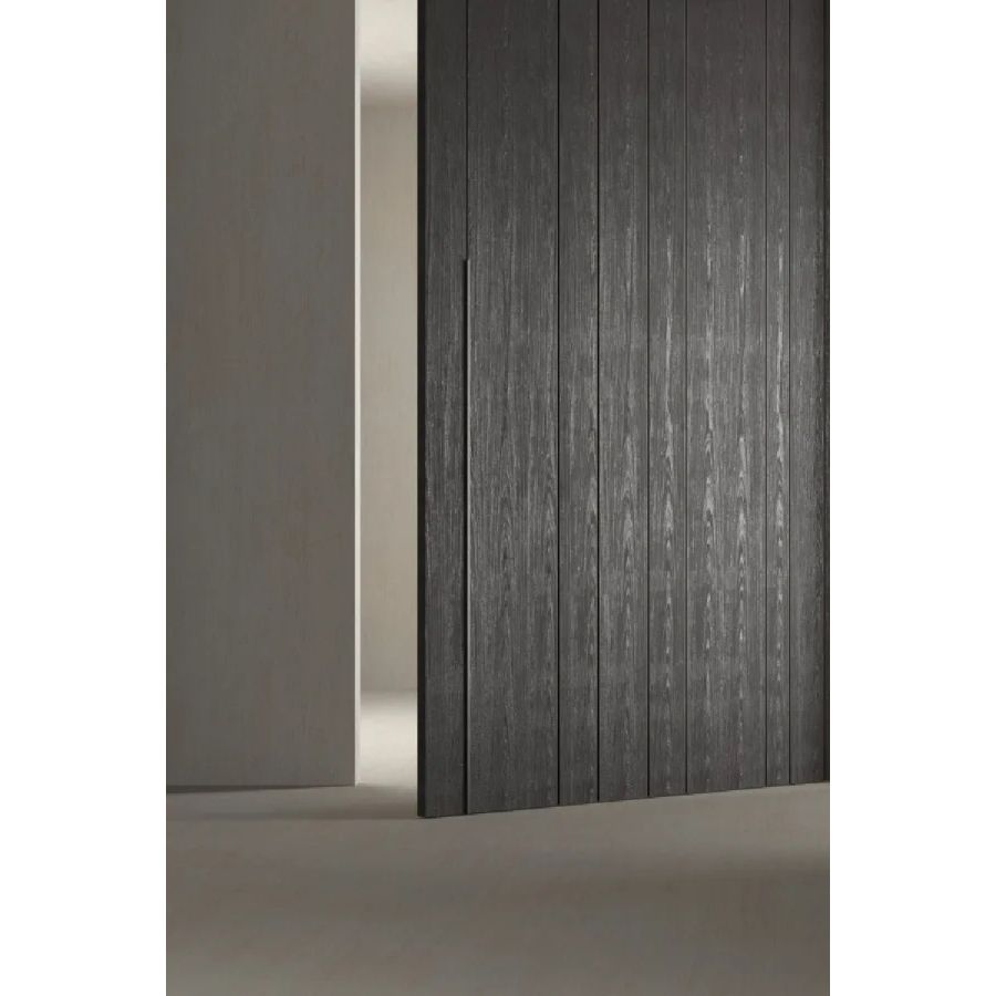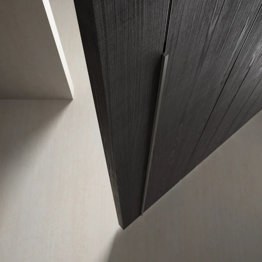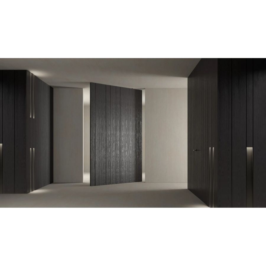 Pivot door in wood with vertical grain, complete with vertical metal inserts in 'Gold' or 'Brown' finish. Metal handle carved into the thickness of the door.