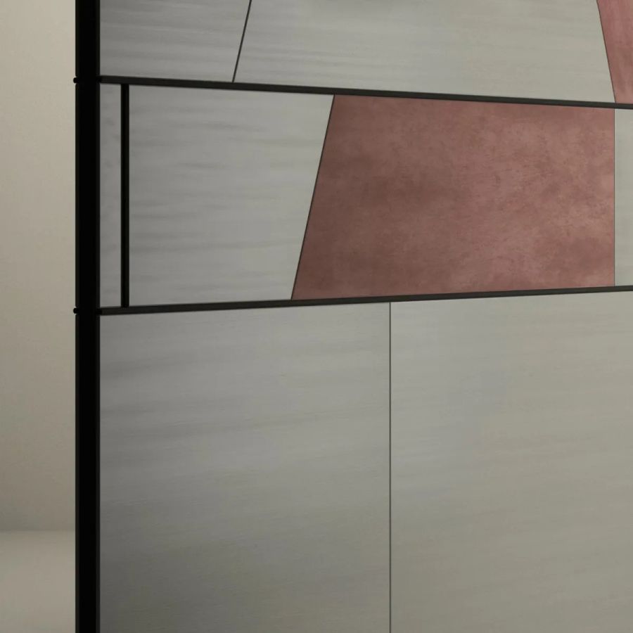 Pivot door in wood, coated on both sides with panels of various geometric shapes, interspersed with rounded section blocks. Metal handle carved into the thickness of the door.