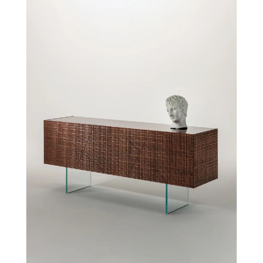 Maxima sideboard with carved hinged or flap doors and structure covered in liquid metal. Legs in extra-clear glass and top in back-lacquered glass. Plain wood interior.