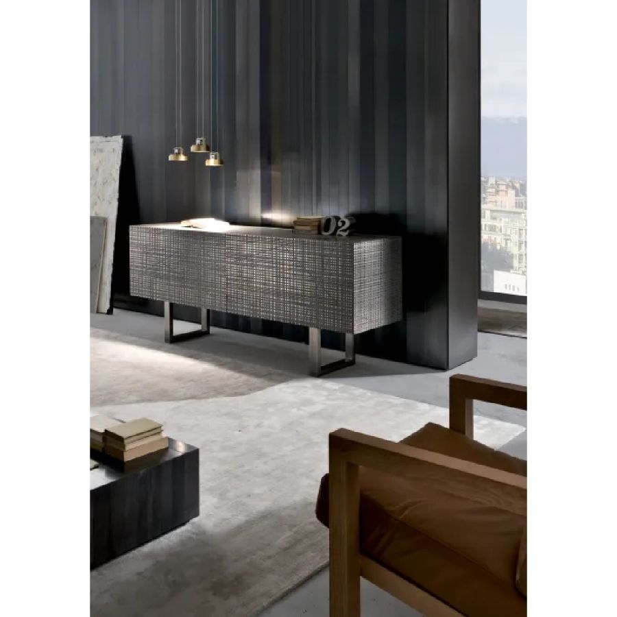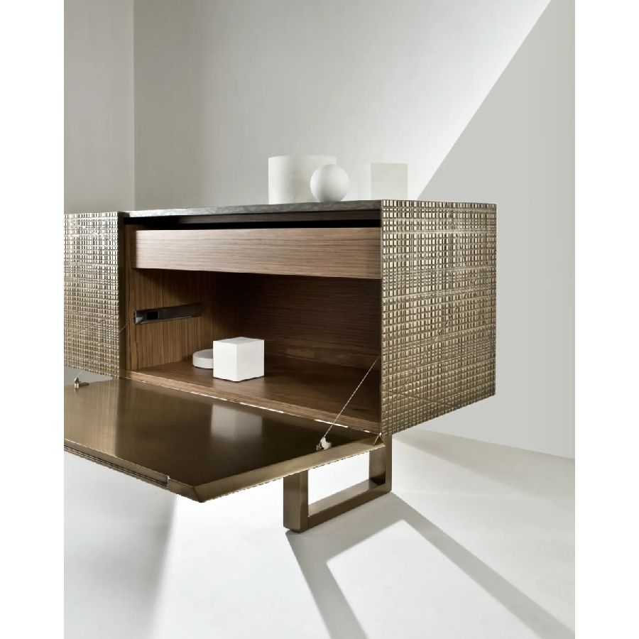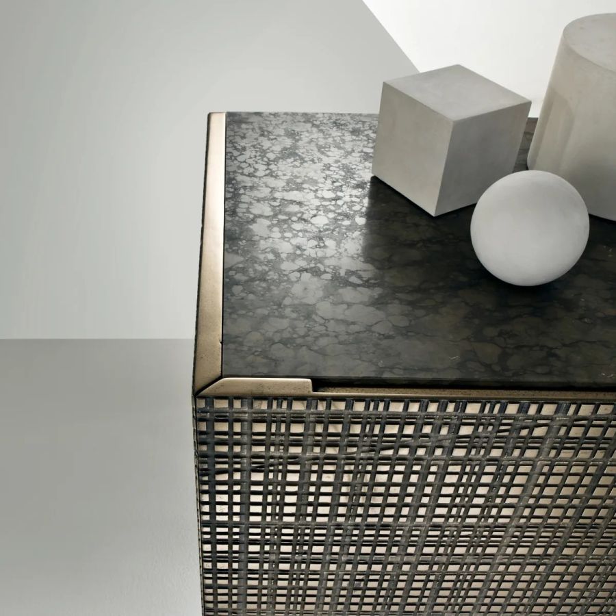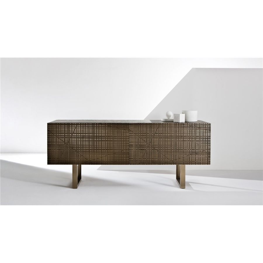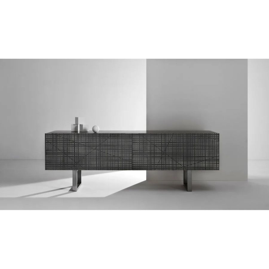 Wooden sideboard with Maxima carved hinged or flap doors and structure covered in liquid metal. Top in liquid metal or marble. Insides in canaletto Walnut.