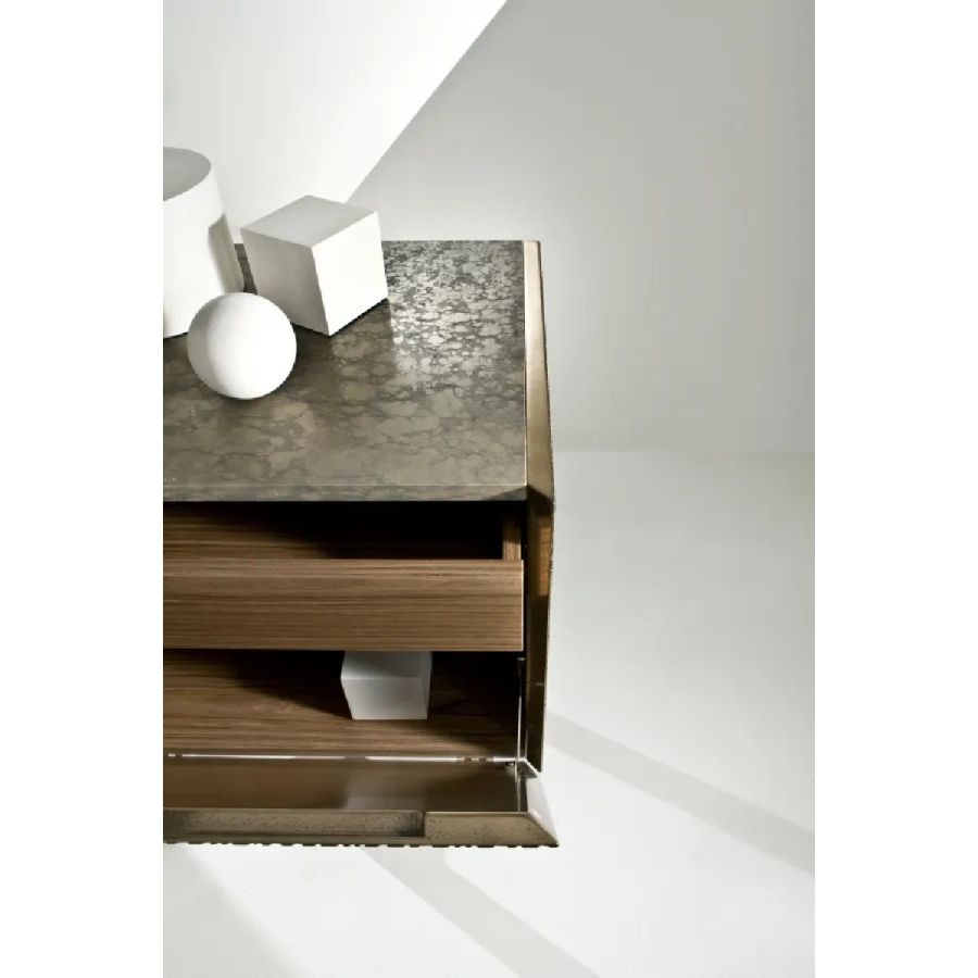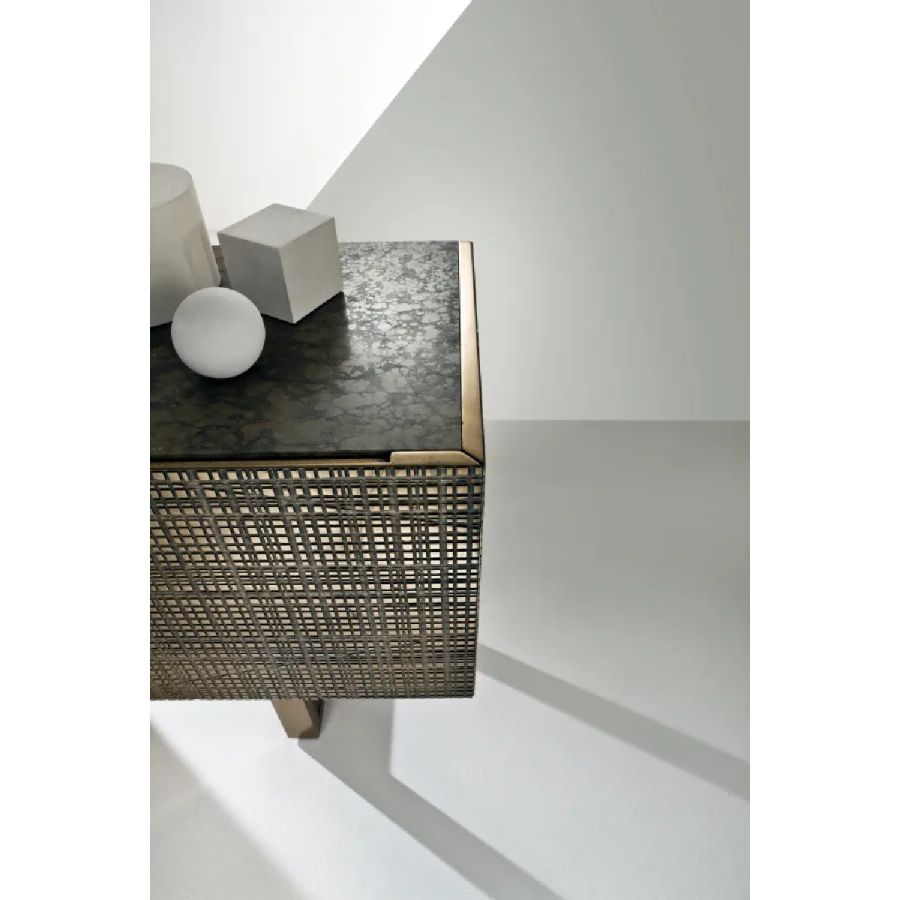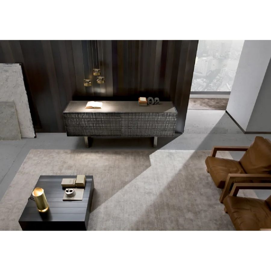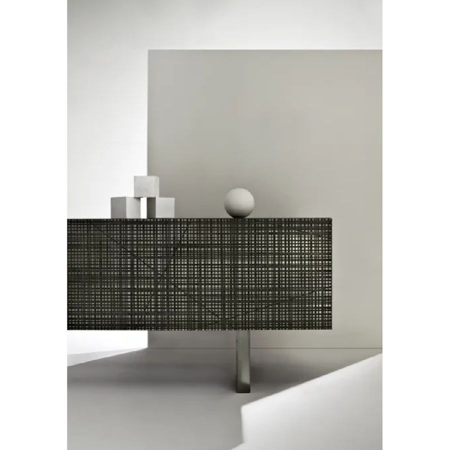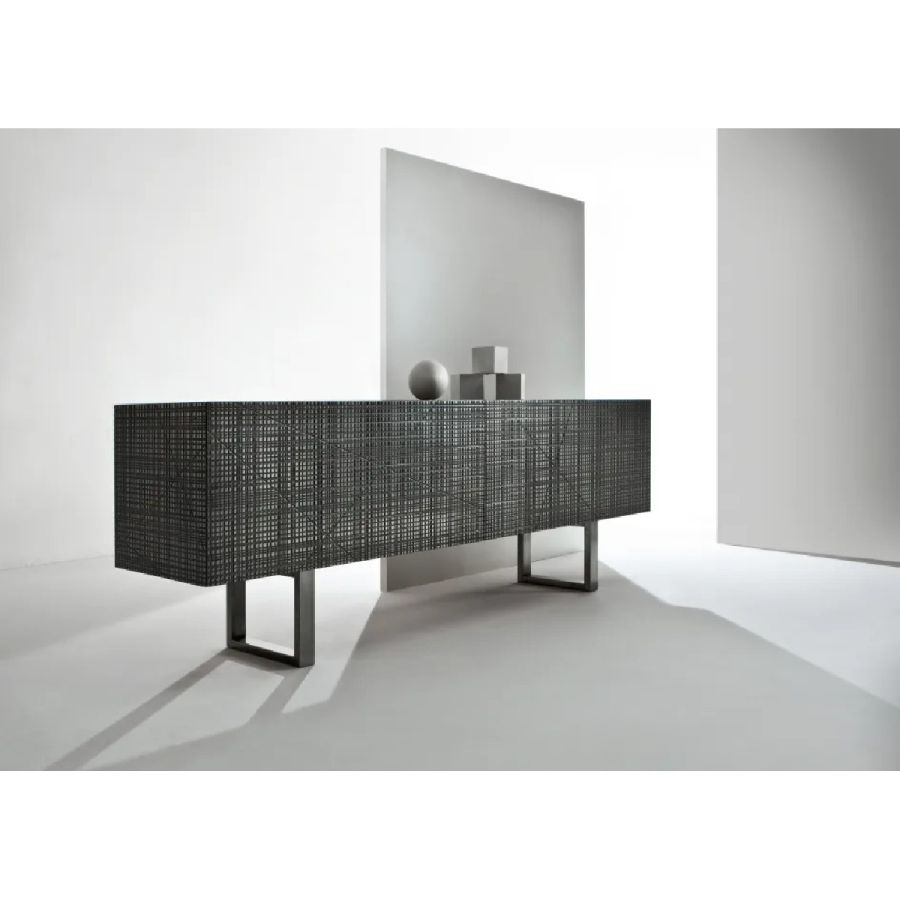 Wooden sideboard with Maxima carved hinged or flap doors and structure covered in liquid metal. Top in liquid metal or marble. Insides in canaletto Walnut.
