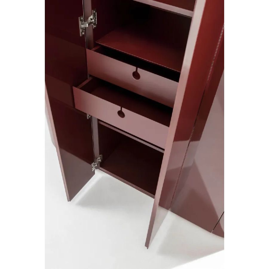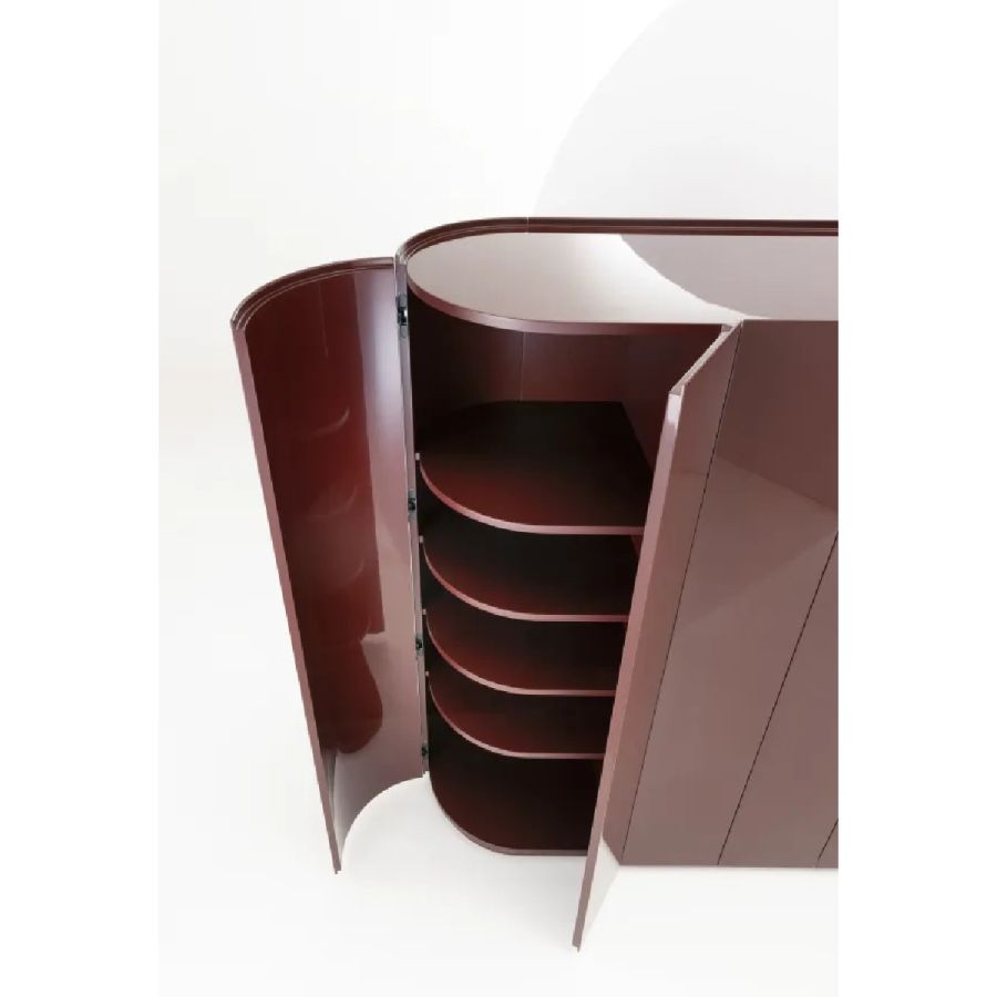 Storage unit with 6 hinged doors and curved sides. Wooden structure finished on all sides. Equipped with internal shelves and drawers.