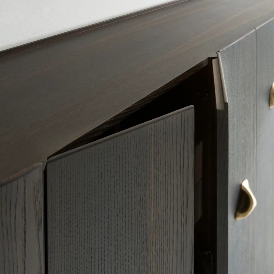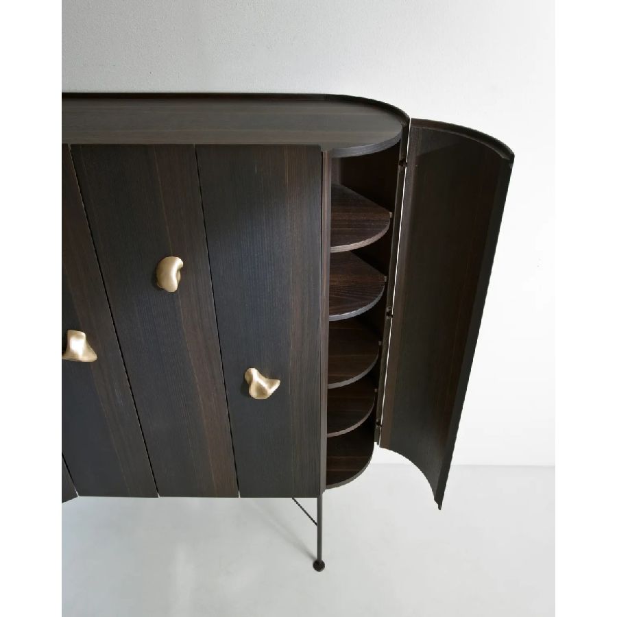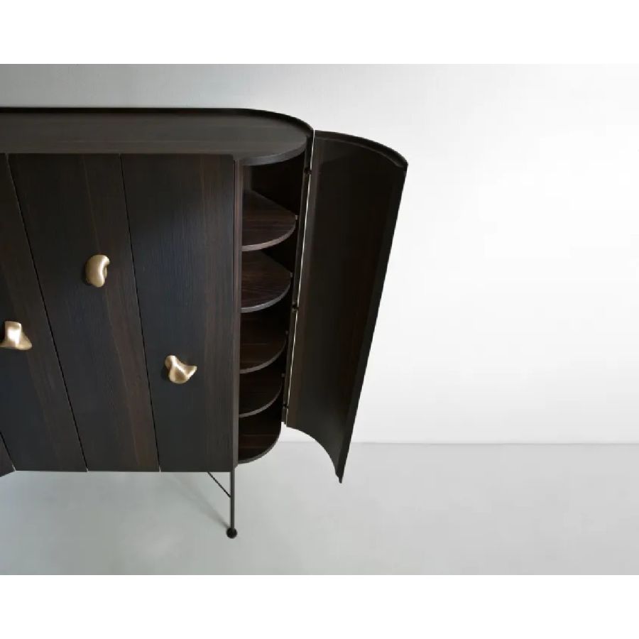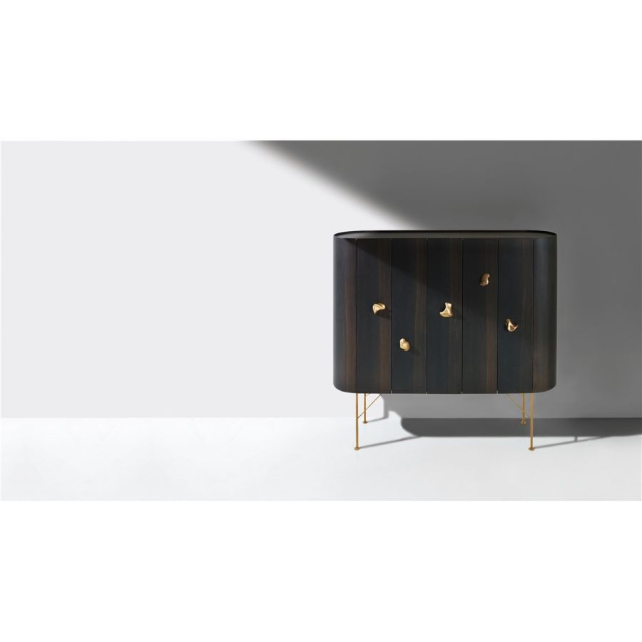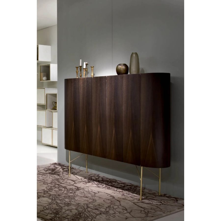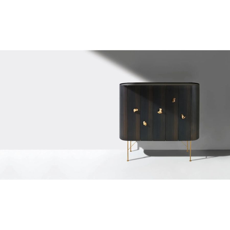Storage unit with 7 hinged doors and curved sides. Structure finished on all sides in special Syberian Ash wood and legs in satin brass. Equipped with internal shelves and drawers.