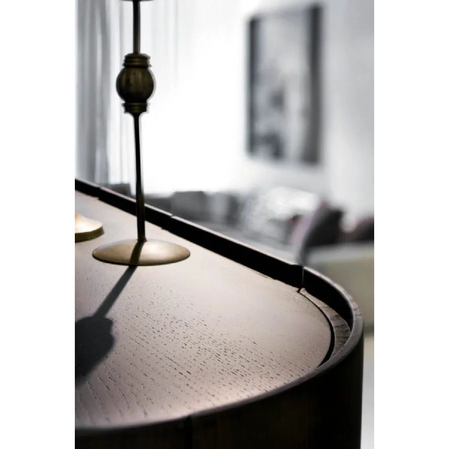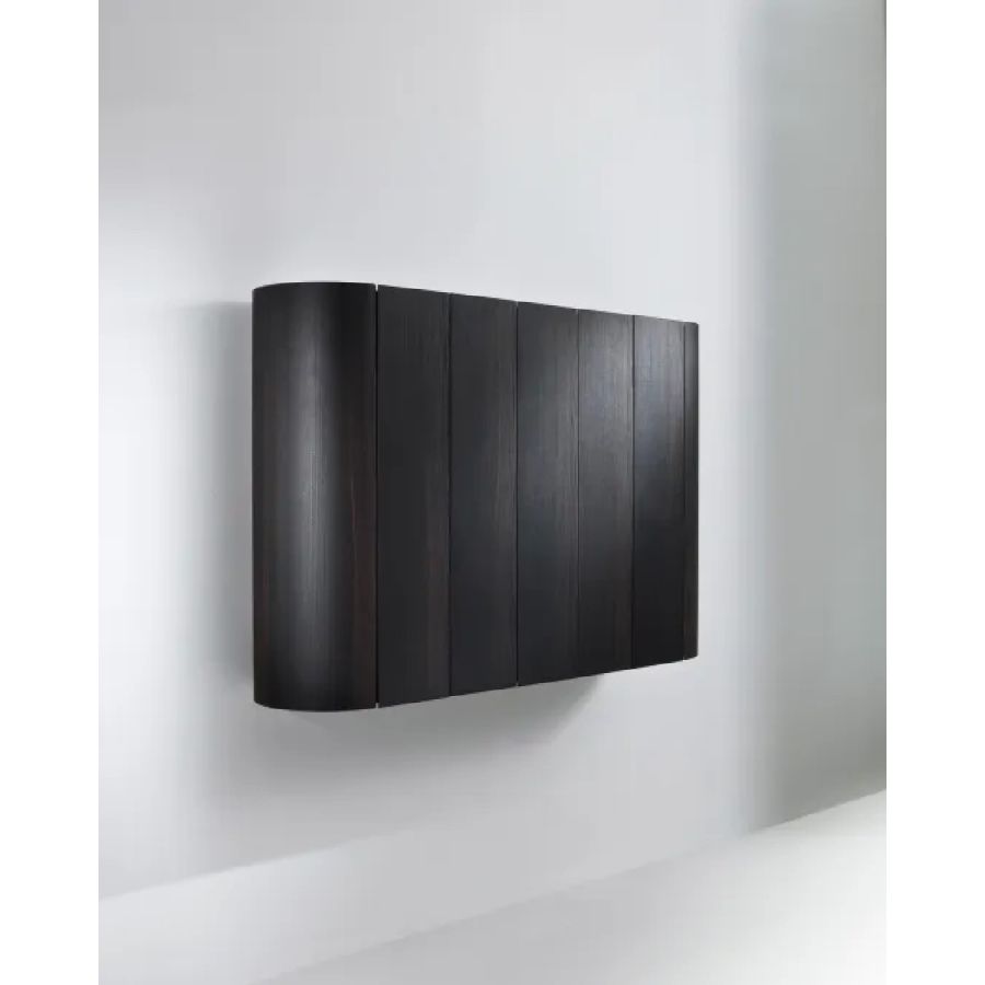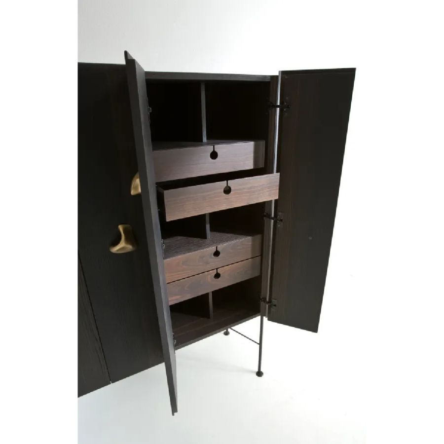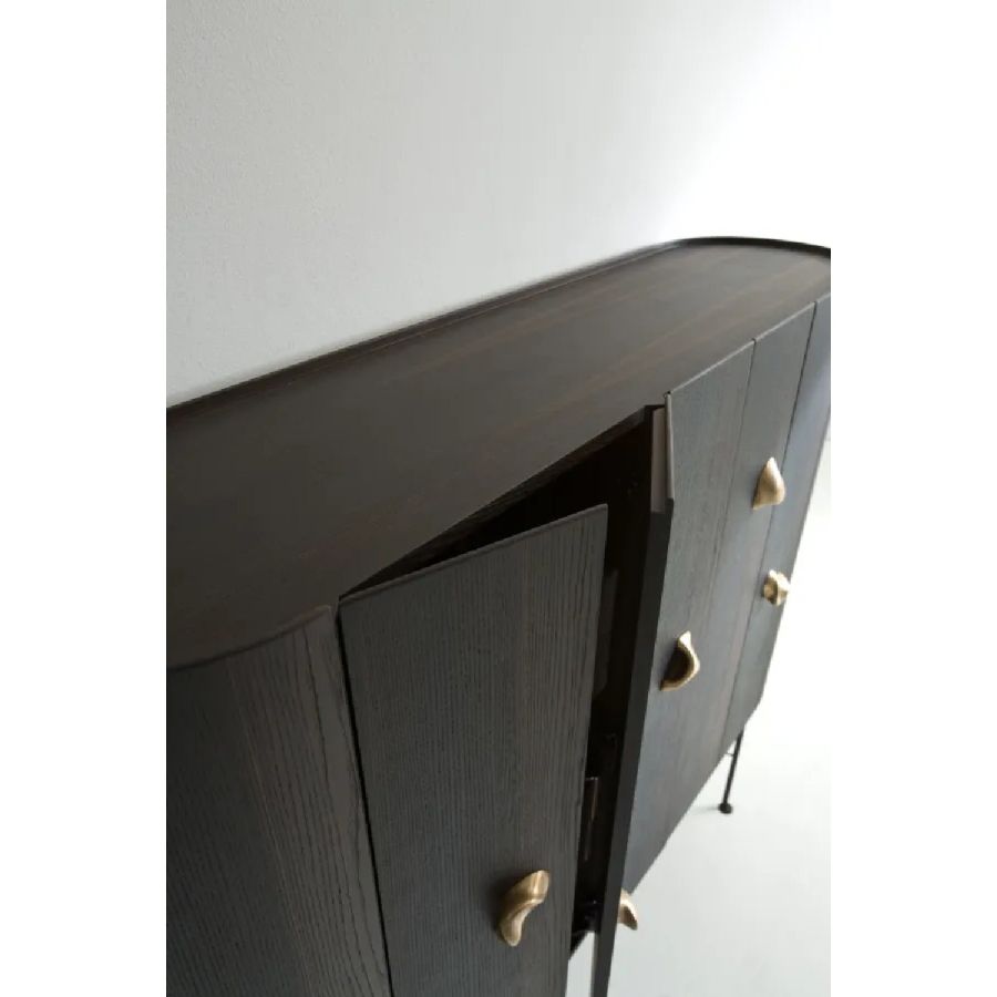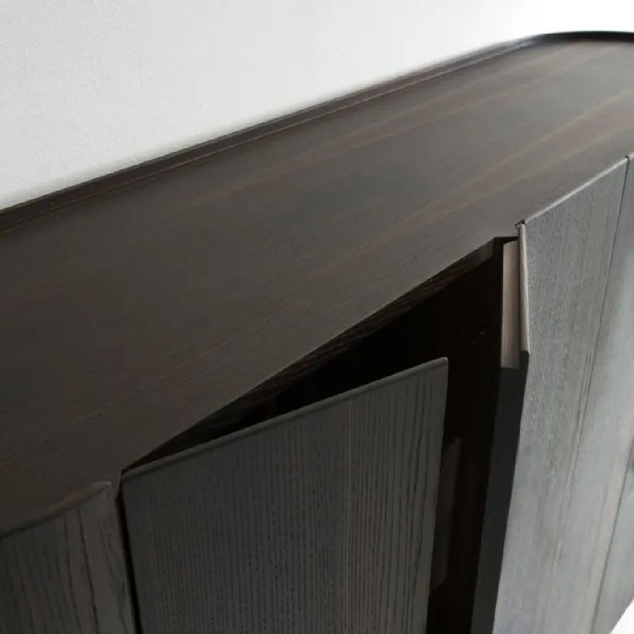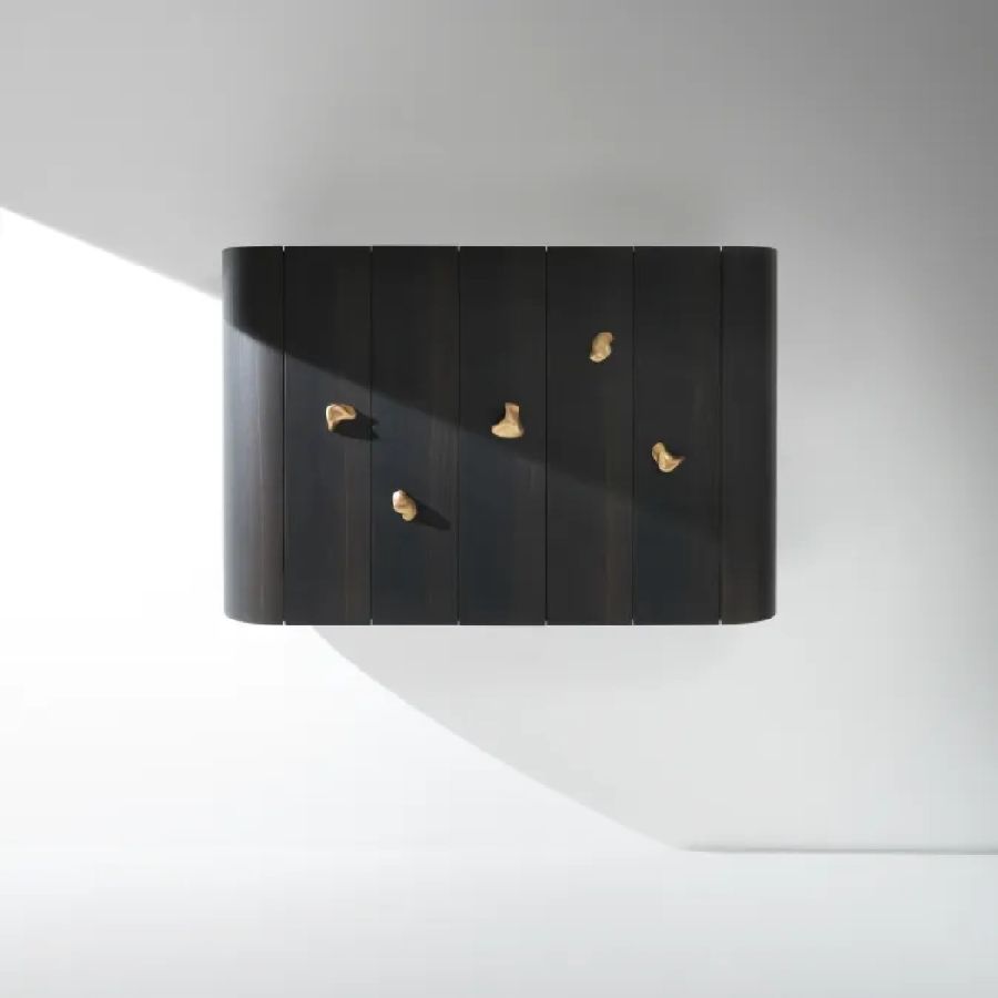 Storage unit with 7 hinged doors and curved sides. Structure finished on all sides in special Syberian Ash wood and legs in satin brass. Equipped with internal shelves and drawers.