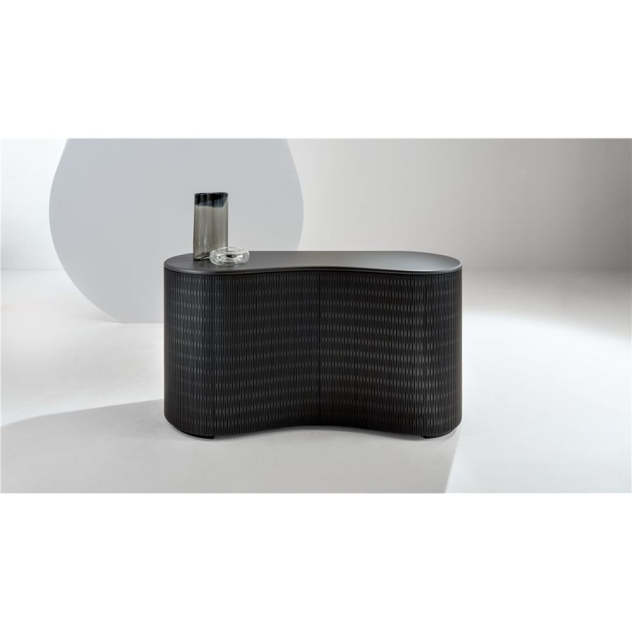 Wooden sideboard with Lacca 61 finish, featuring a curved shape and equipped with two hinged doors.