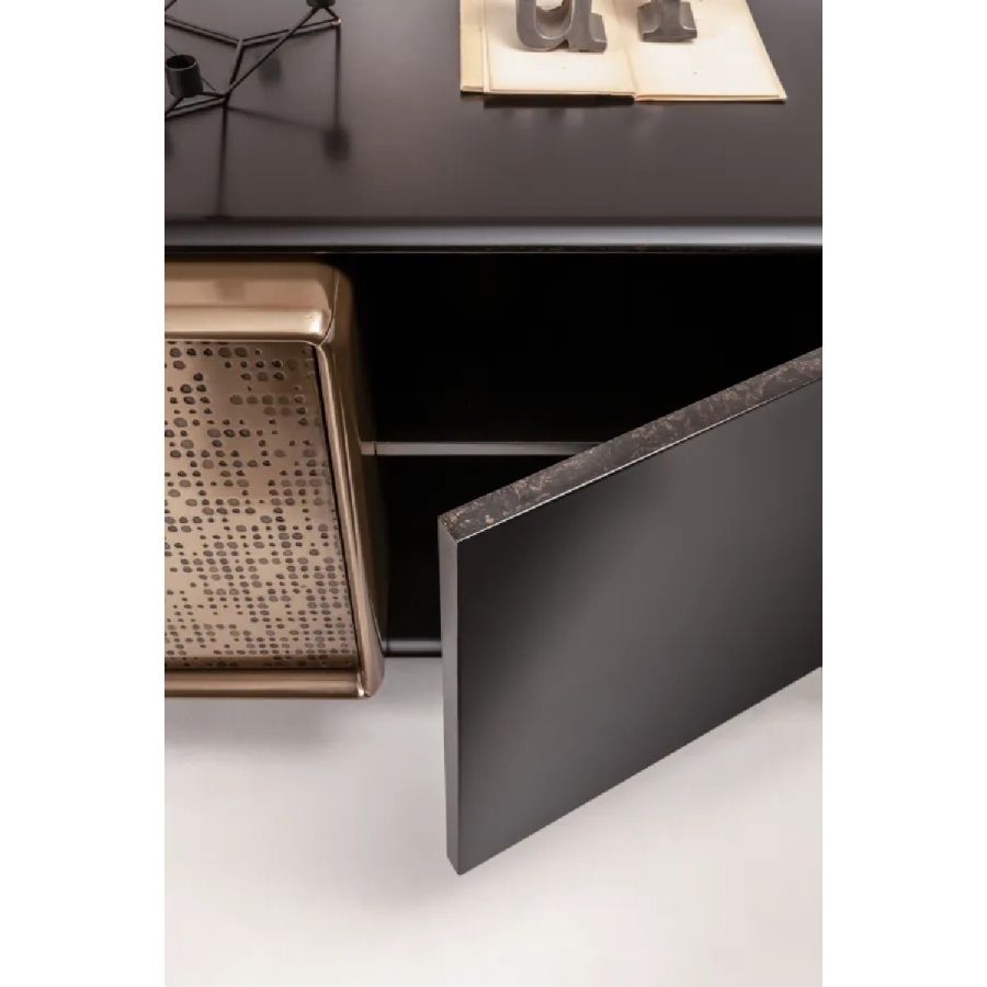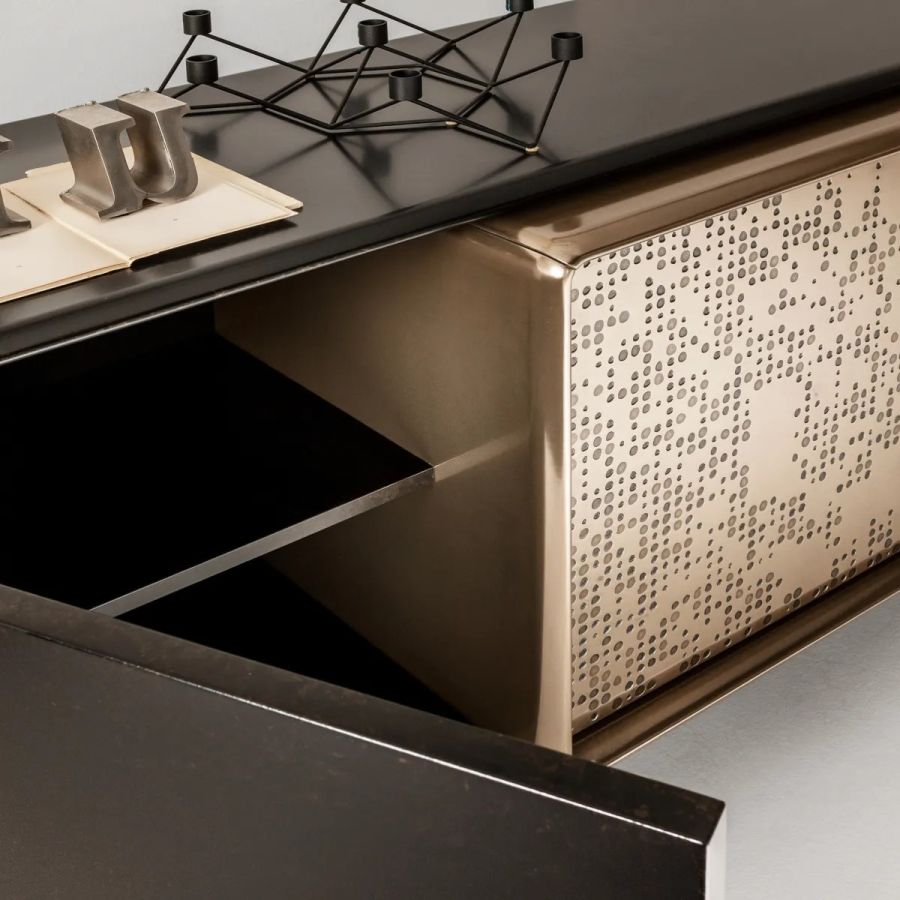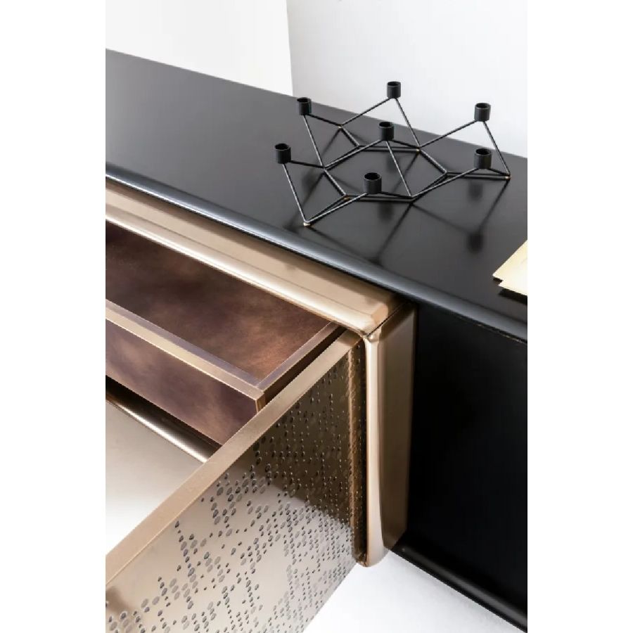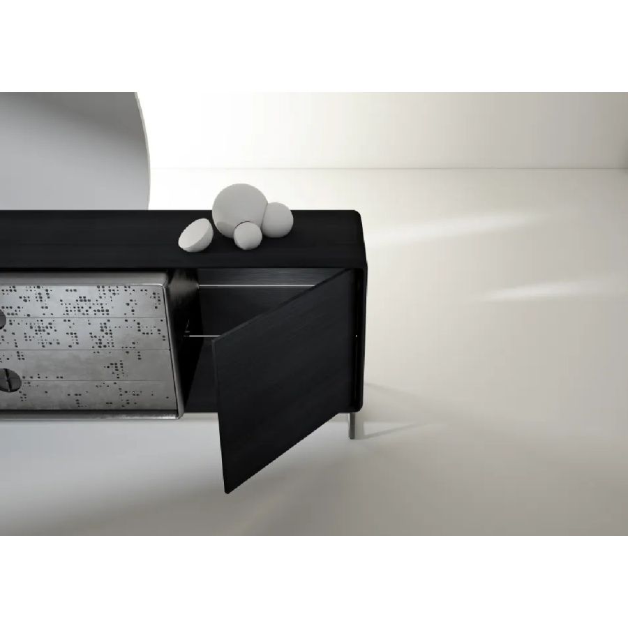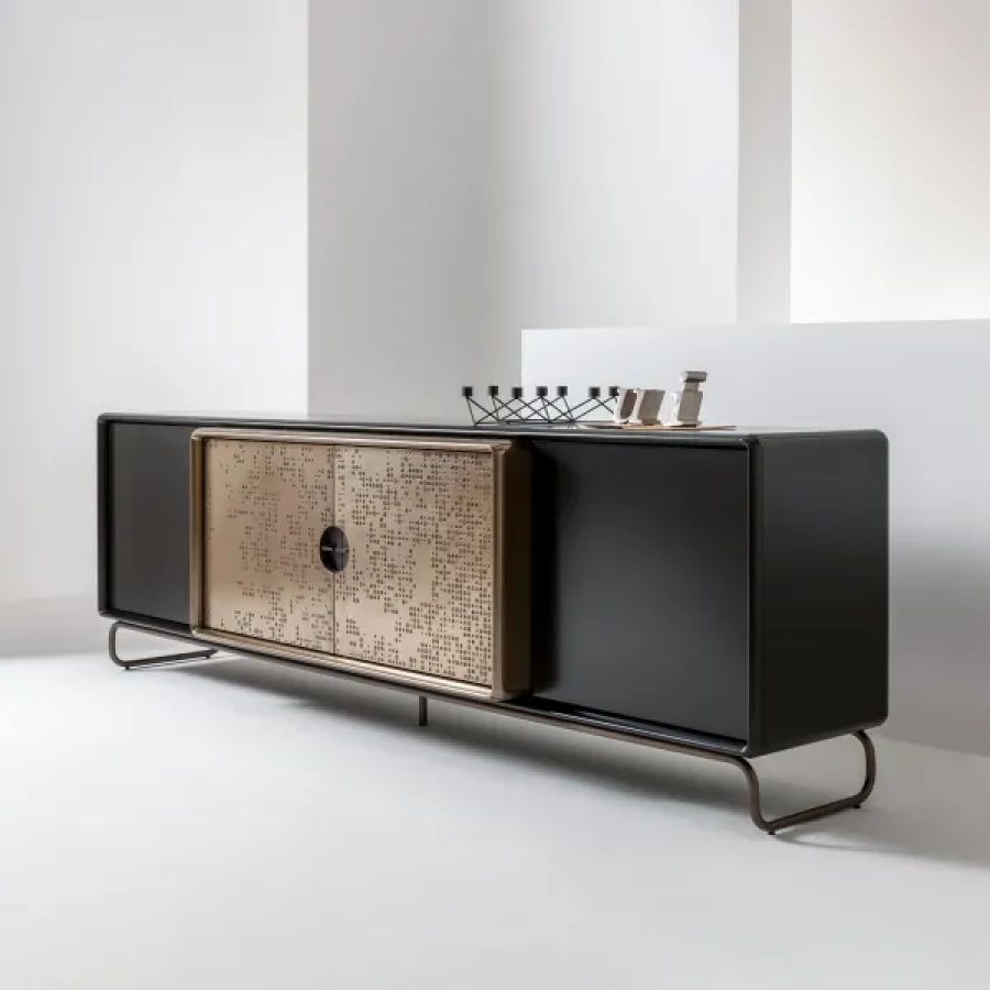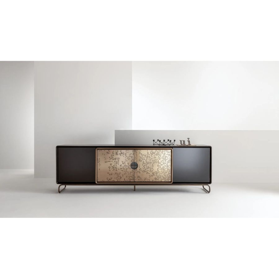 Wooden sideboard with doors or drawers in liquid metal with Unlimited texture, tubular metal legs and designer handle in burnished brass.