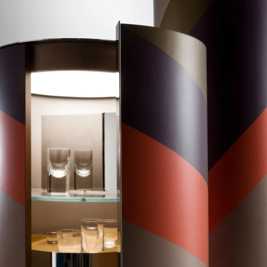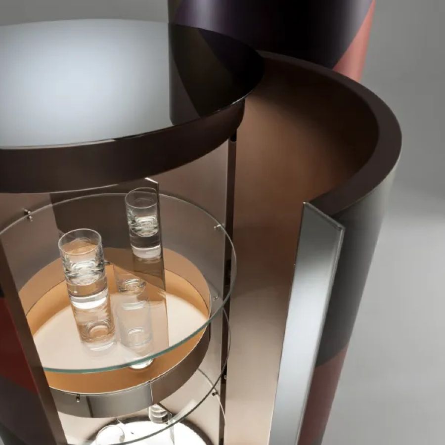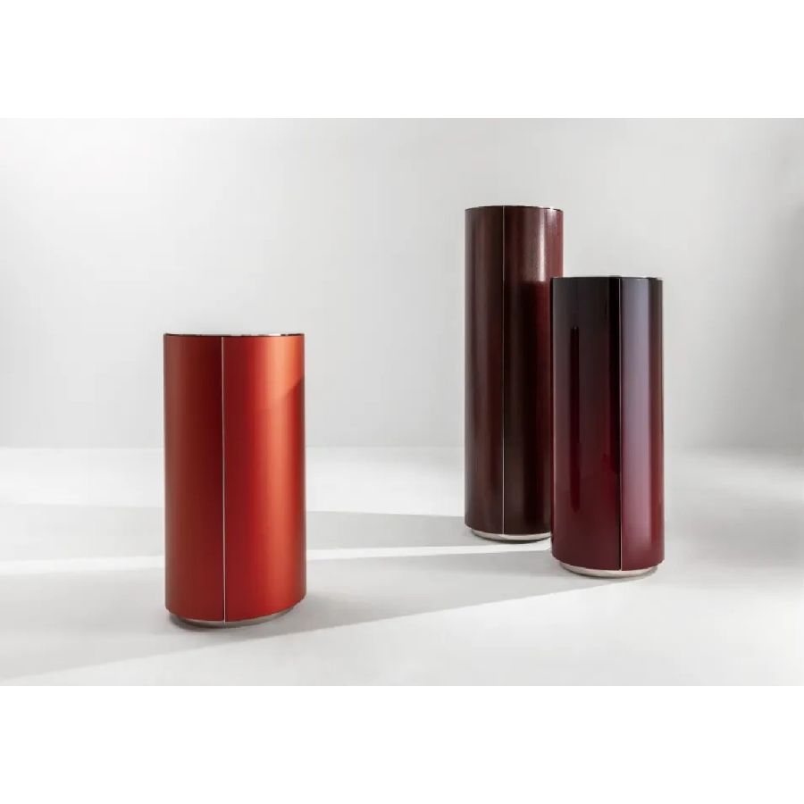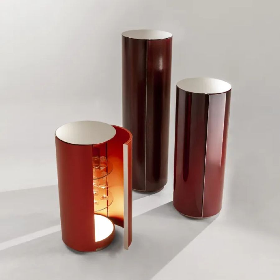 Totem with wooden structure and Lacca 61 finish in one or more colours. Top, handle and base in polished steel. Equipped with extra-light glass shelves and LED lighting.