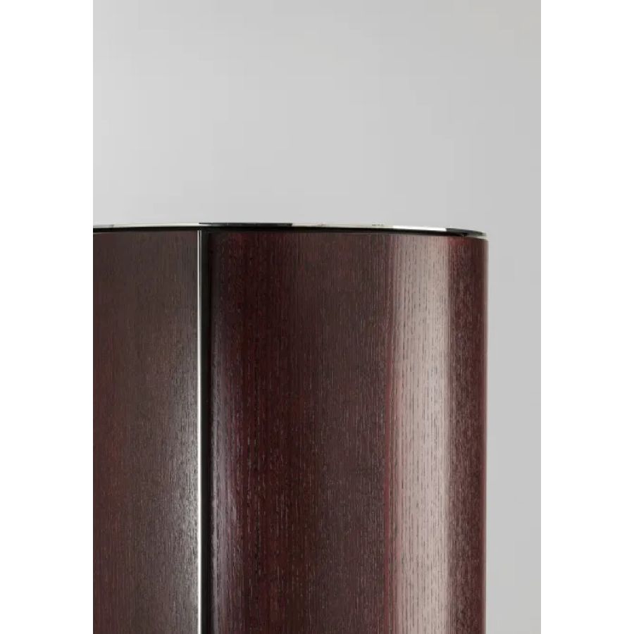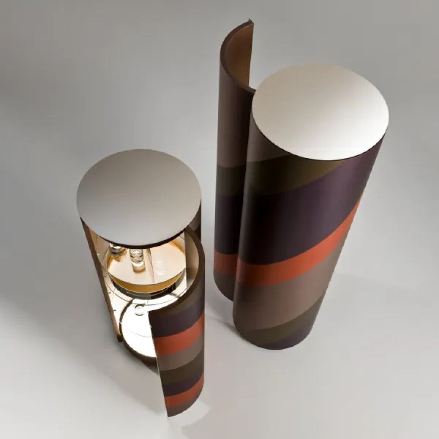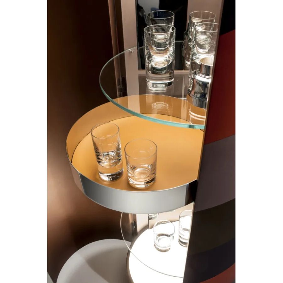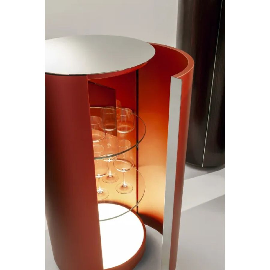 Totem with wooden structure and Lacca 61 finish in one or more colours. Top, handle and base in polished steel. Equipped with extra-light glass shelves and LED lighting.