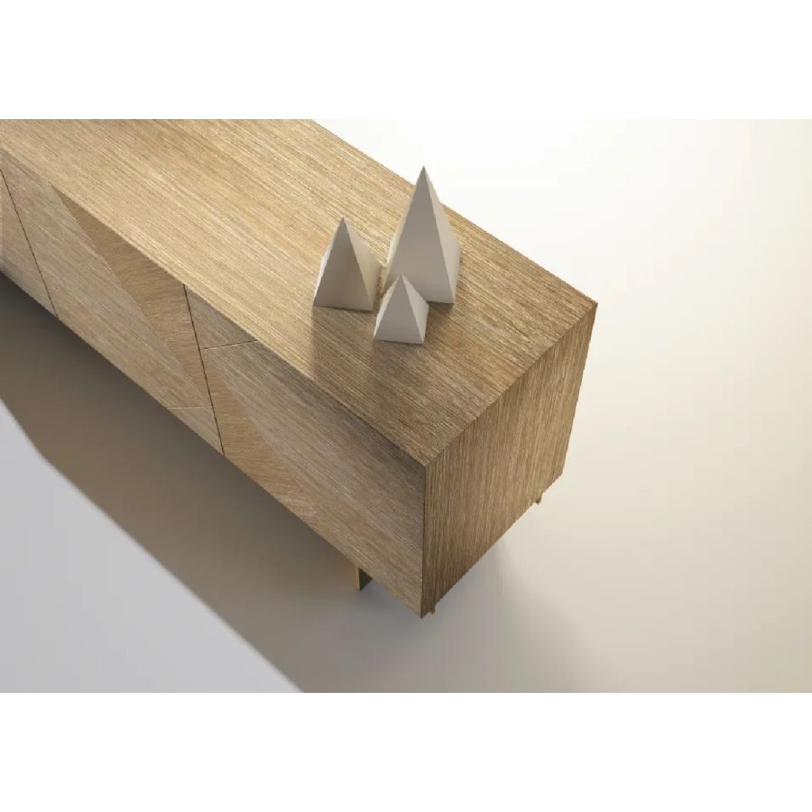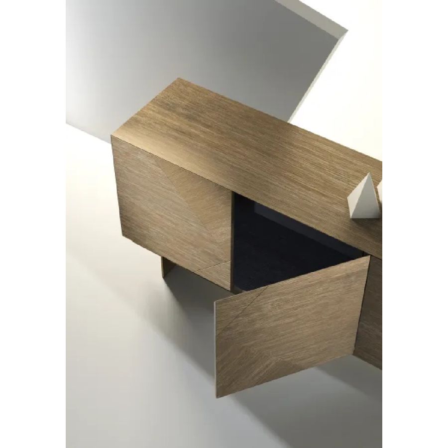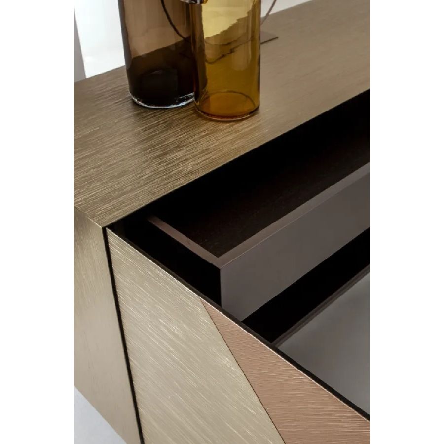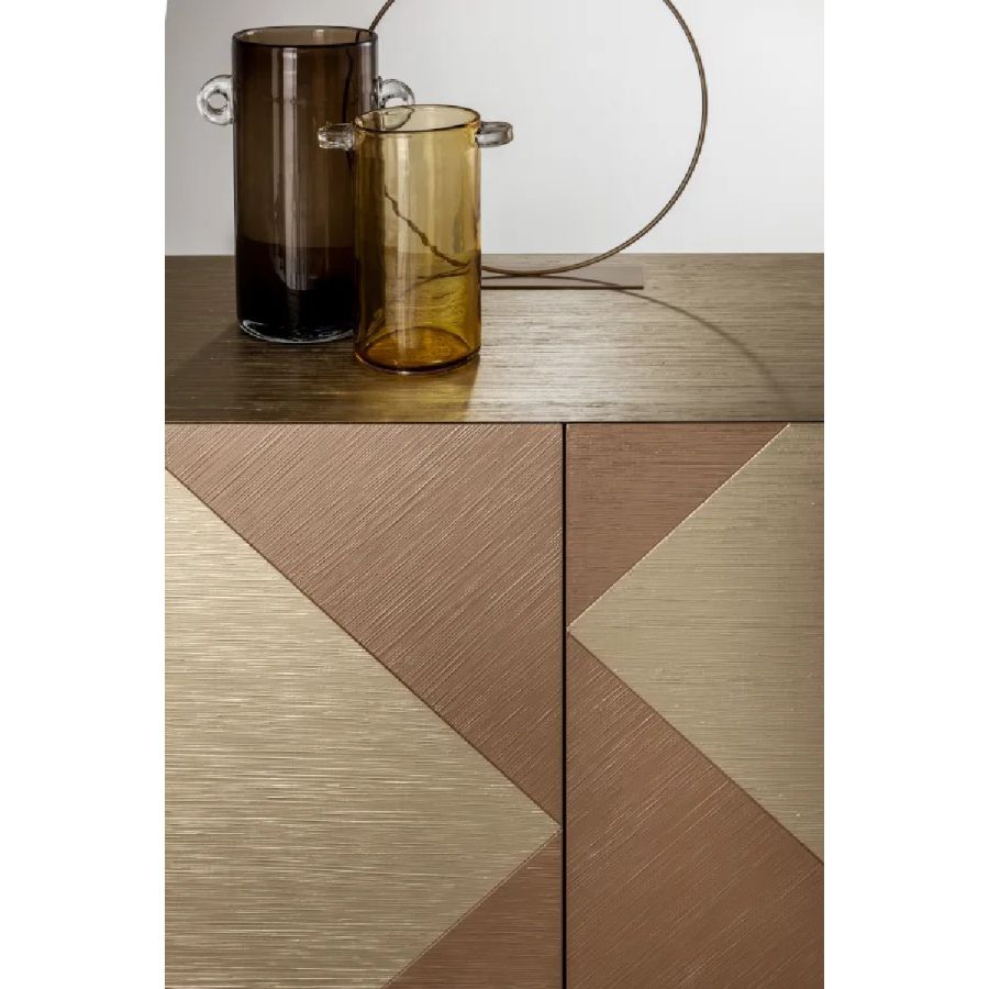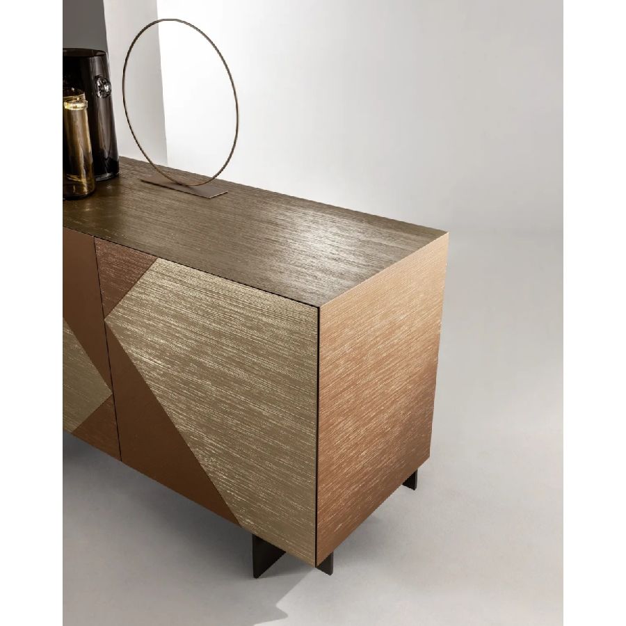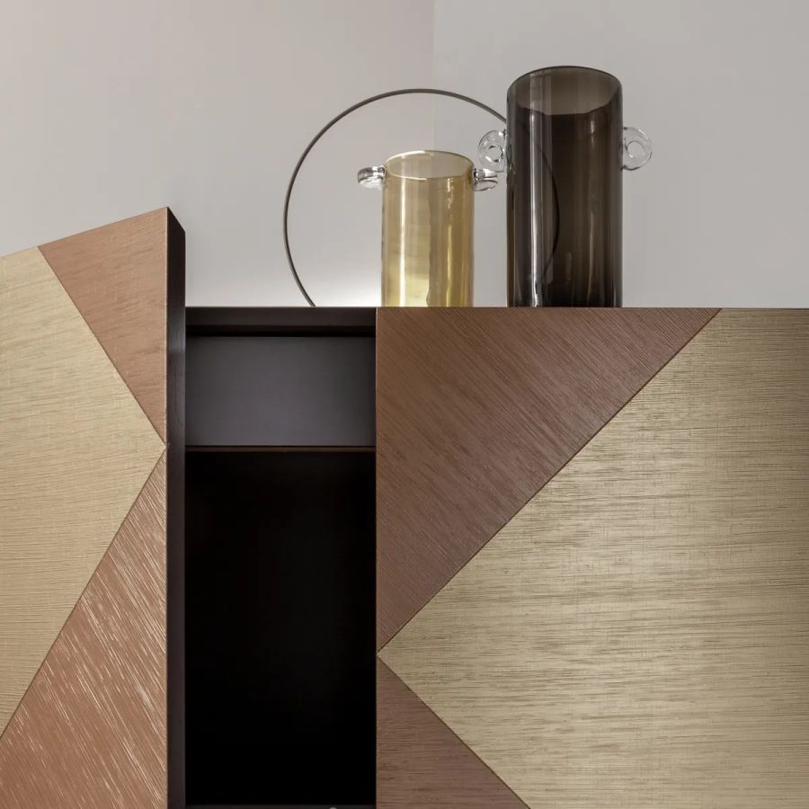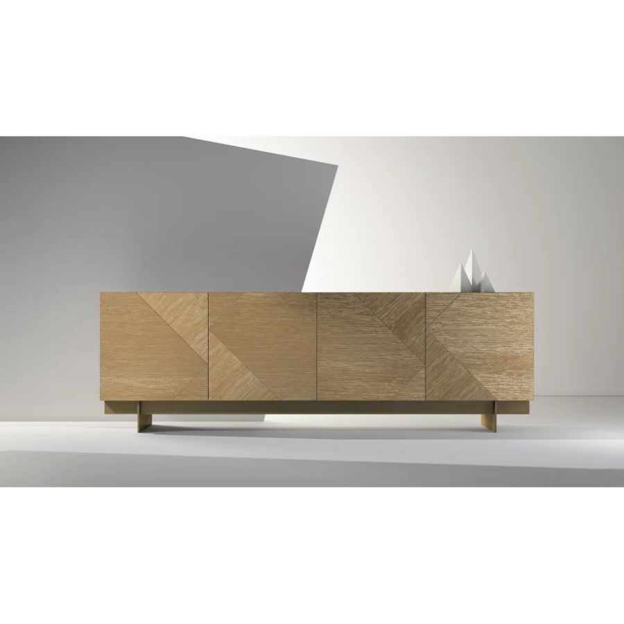 Sideboard with wooden structure and hinged doors with Tatami decoration, plain wood interior and lacquered metal base.