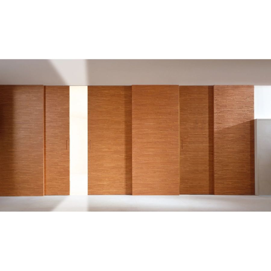 Sliding door in carved wood with horizontal or vertical Decor texture on both sides.