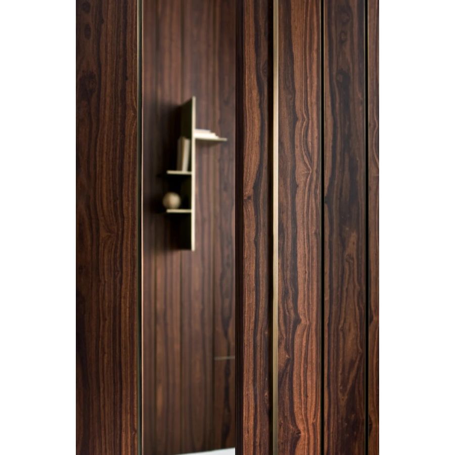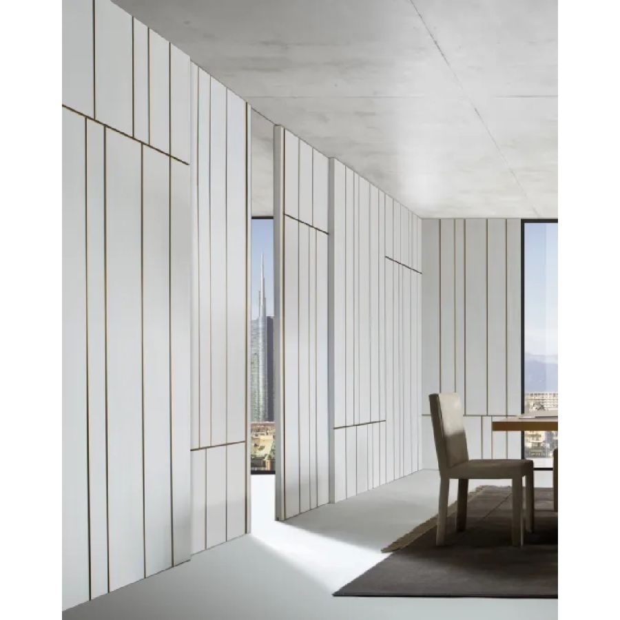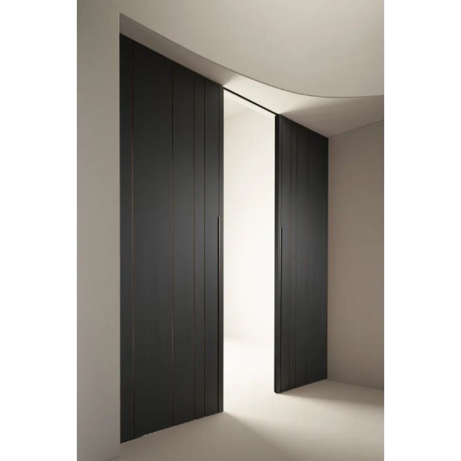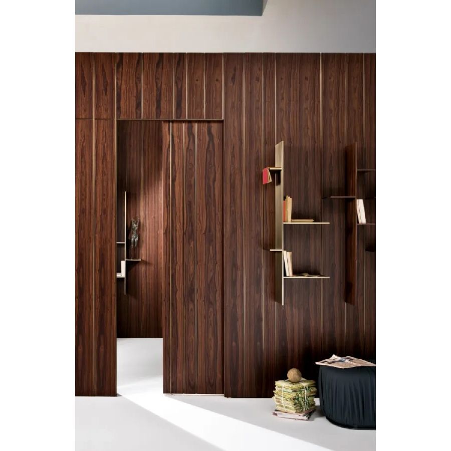 Sliding door in wood with vertical grain, complete with vertical metal inserts in 'Gold' or 'Brown' finish. Metal handle carved into the thickness of the door.
