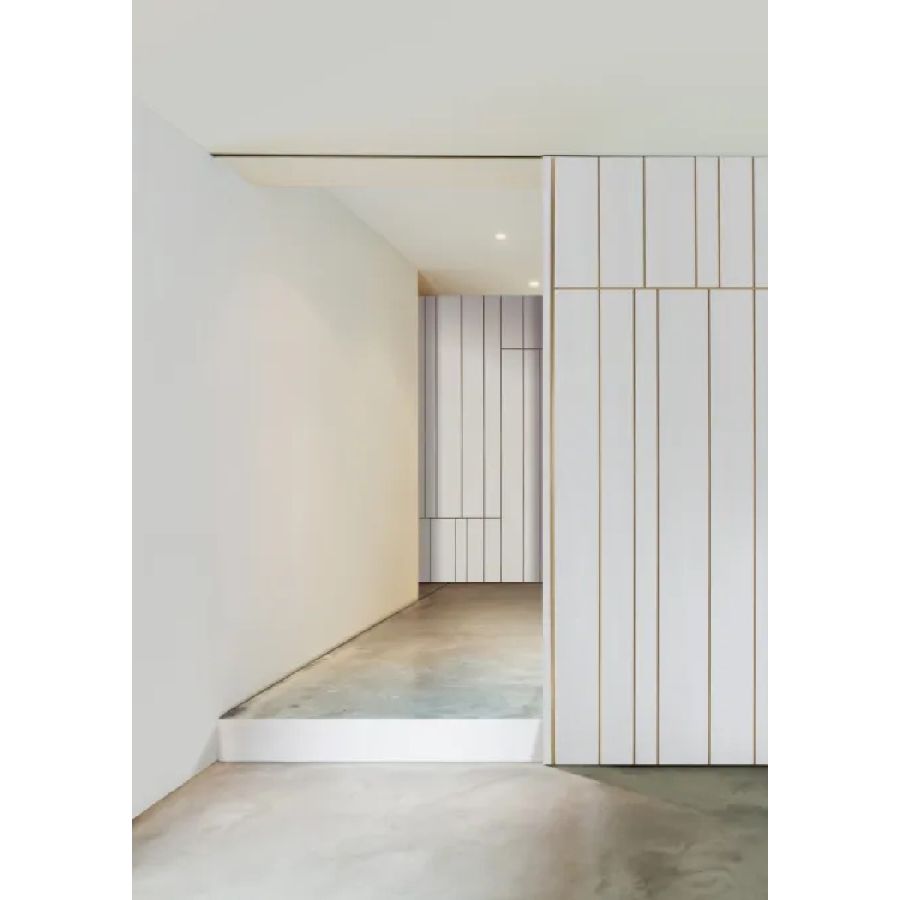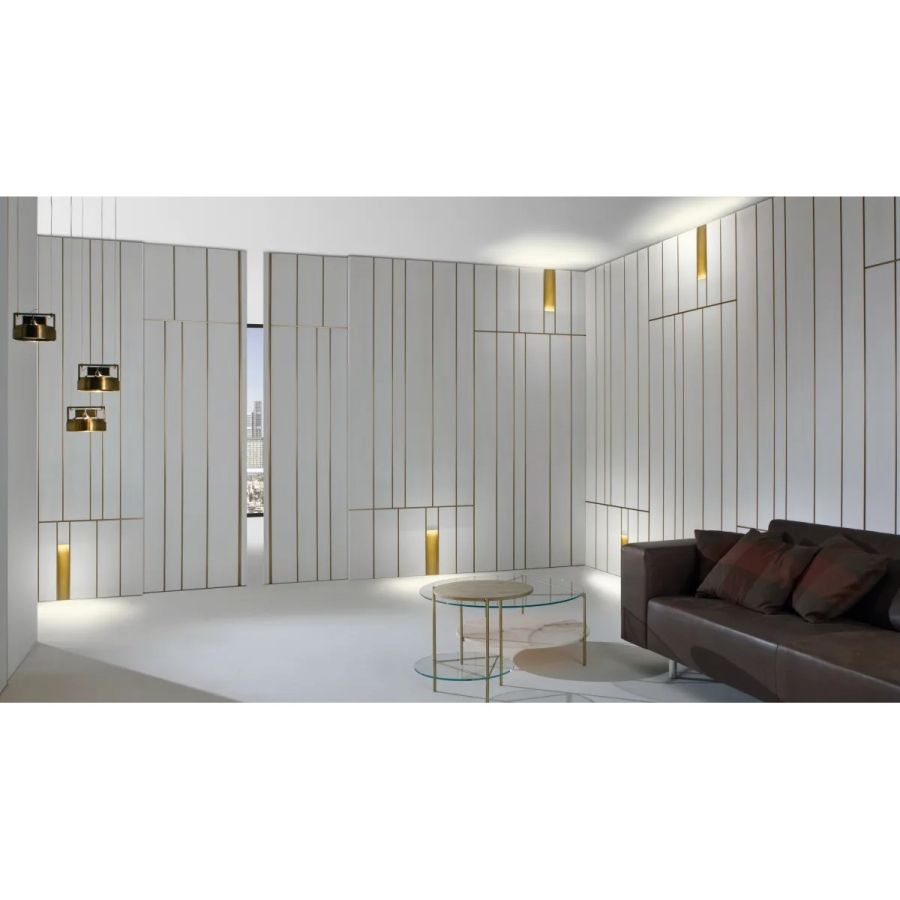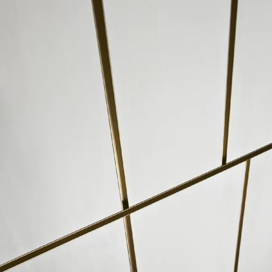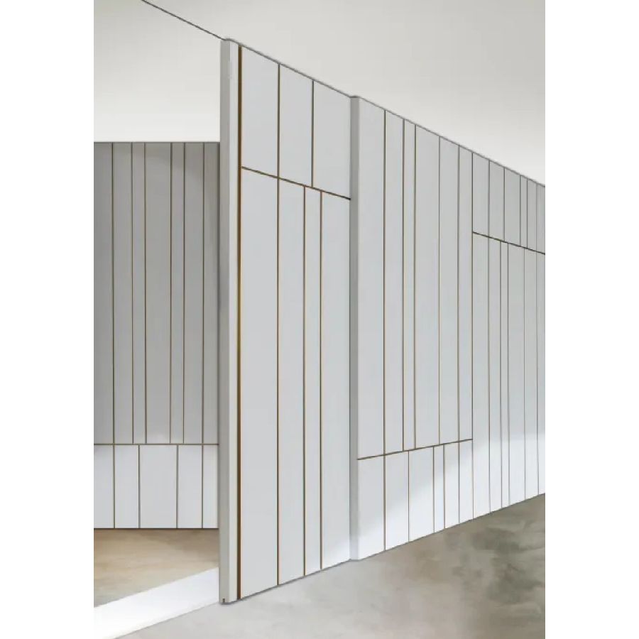 Sliding door in wood with vertical grain, complete with vertical metal inserts in 'Gold' or 'Brown' finish. Metal handle carved into the thickness of the door.