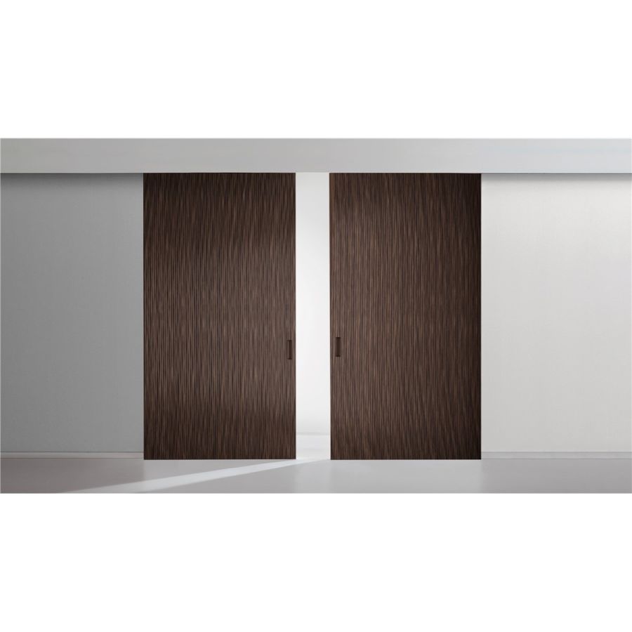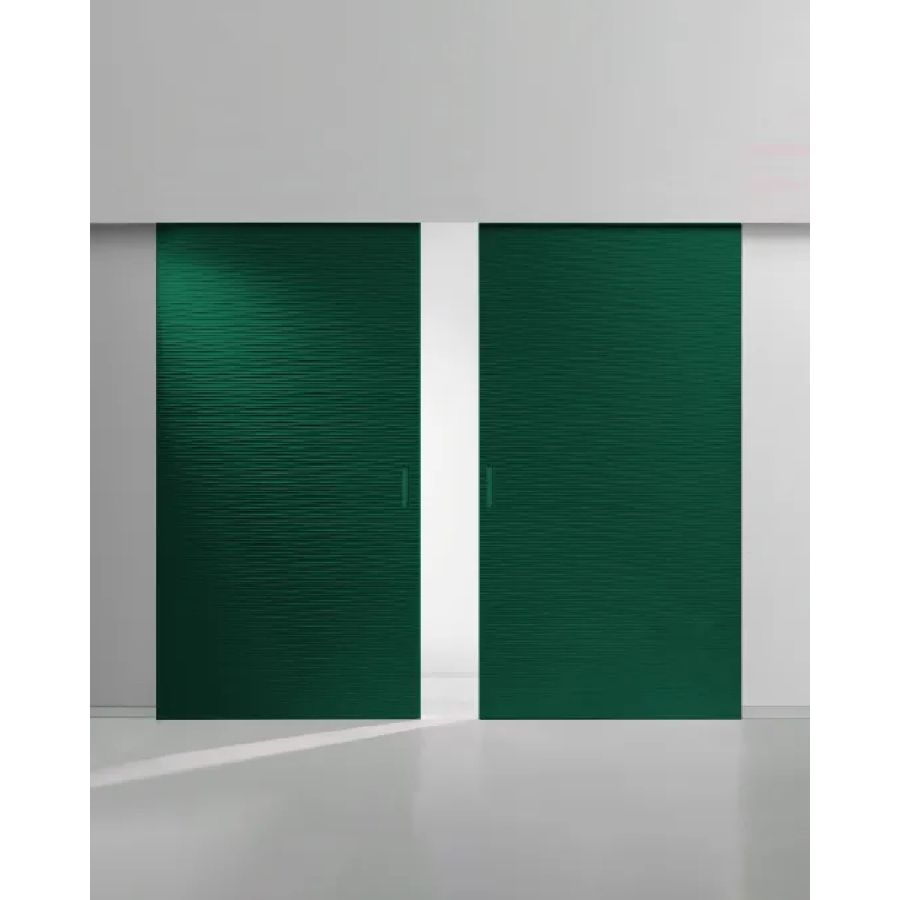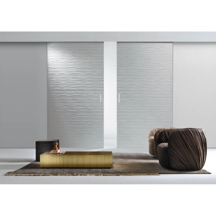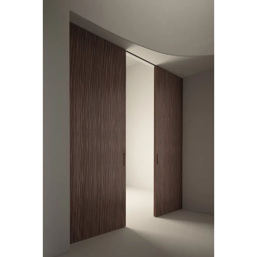 Sliding door in carved wood with horizontal or vertical Onda texture on both sides. Metal handle carved into the thickness of the door.