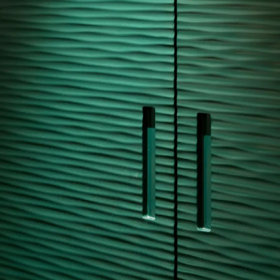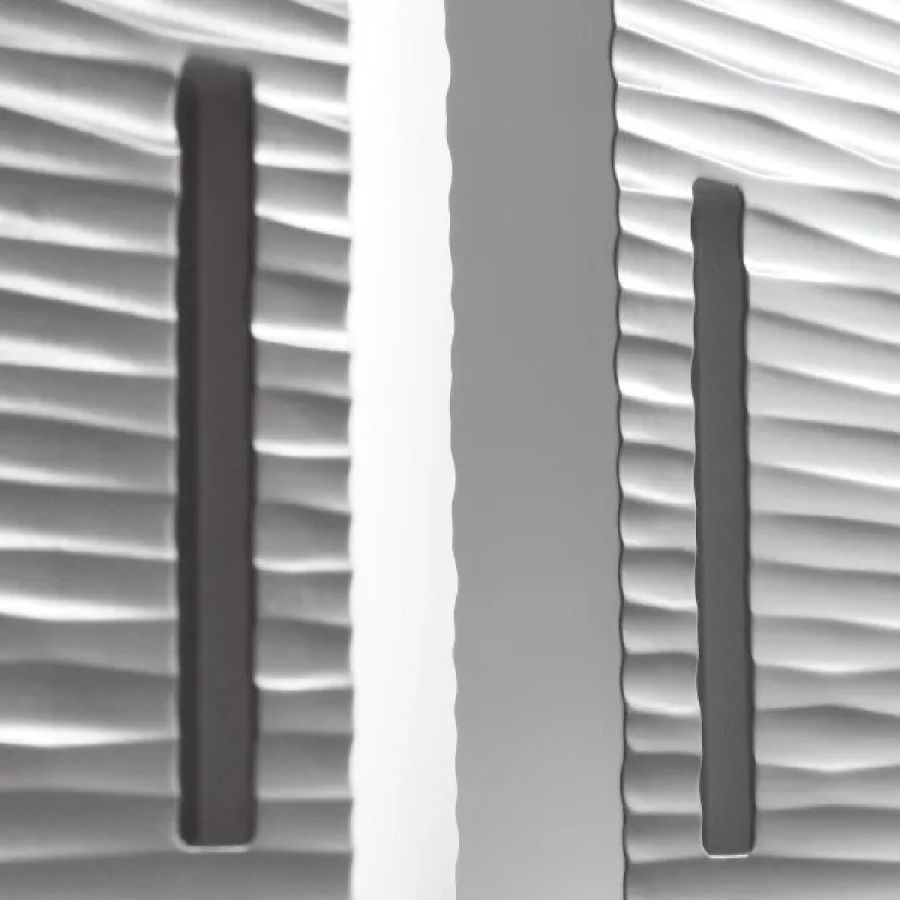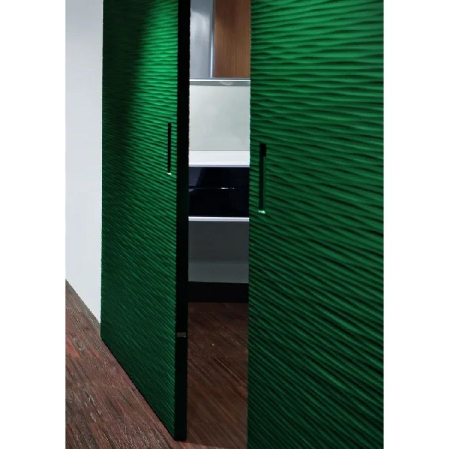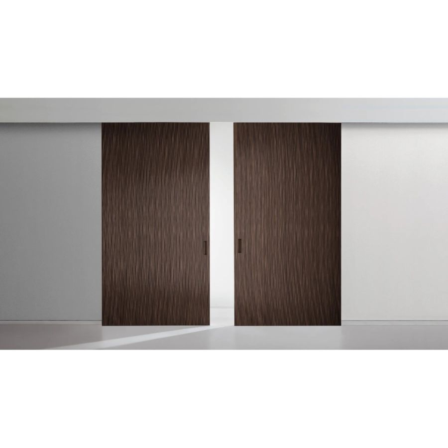 Sliding door in carved wood with horizontal or vertical Onda texture on both sides. Metal handle carved into the thickness of the door.
