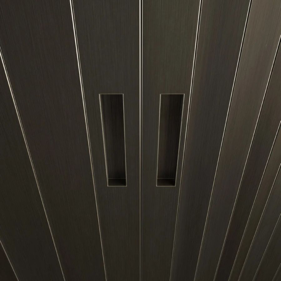 Metal handle carved into the thickness of the door. Customizable in all the metals of the Stars collection: satin brass, burnished brass, satin copper, burnished copper, polished steel or black iron 'cenere'.