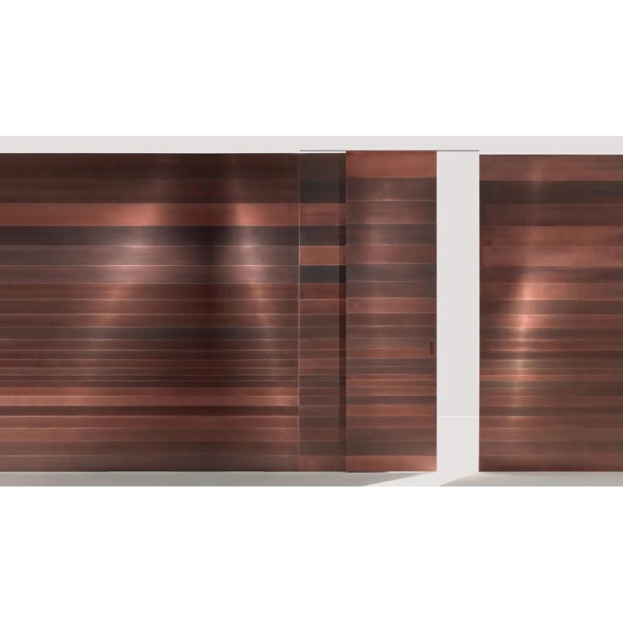 Blockboard sliding door, clad on both sides with with 1 millimiter metal bands of different sizes.