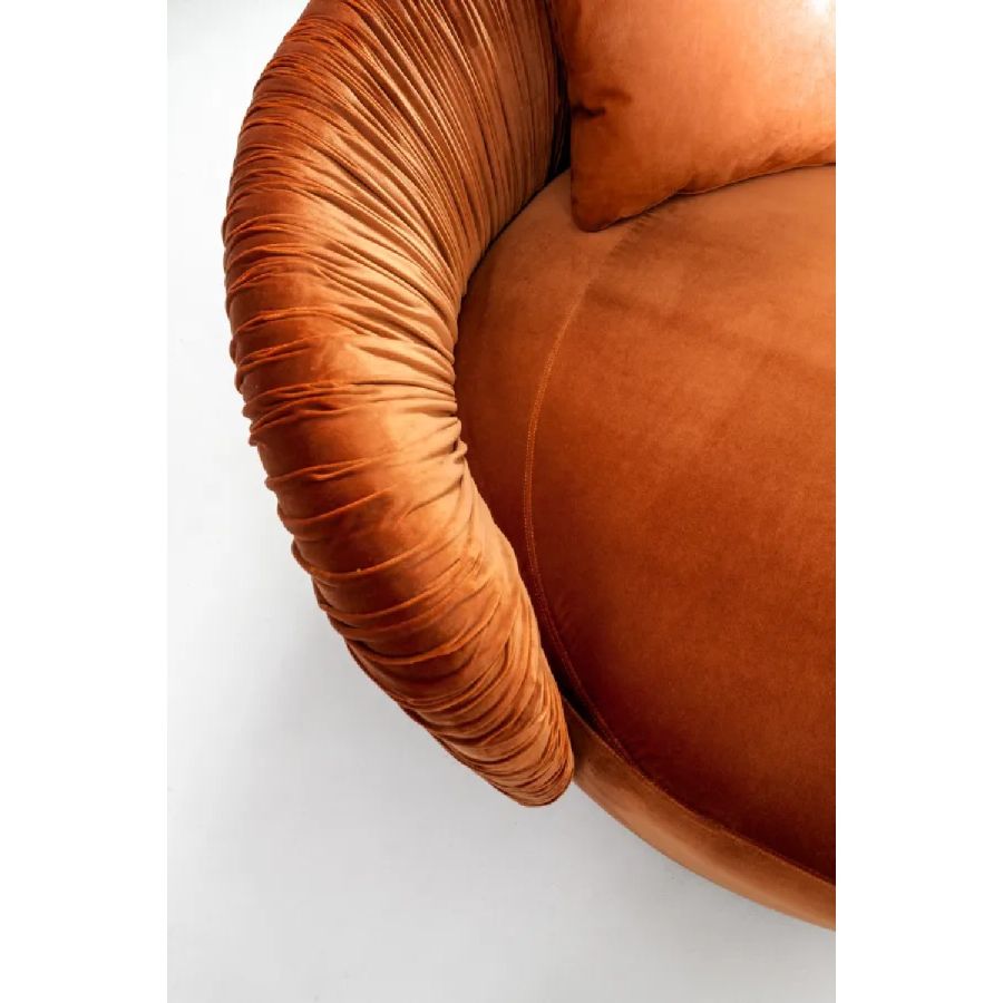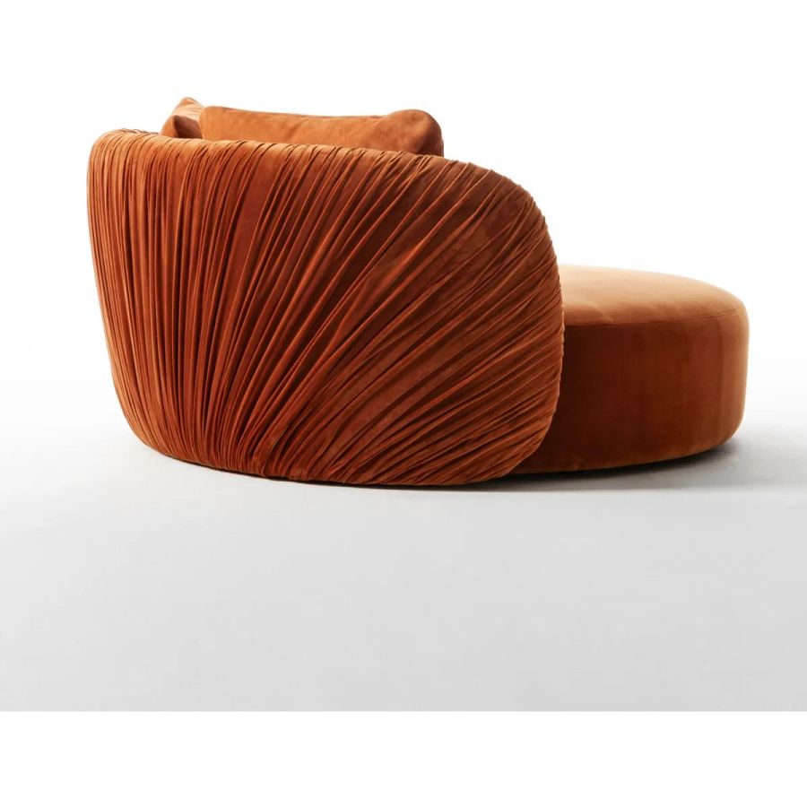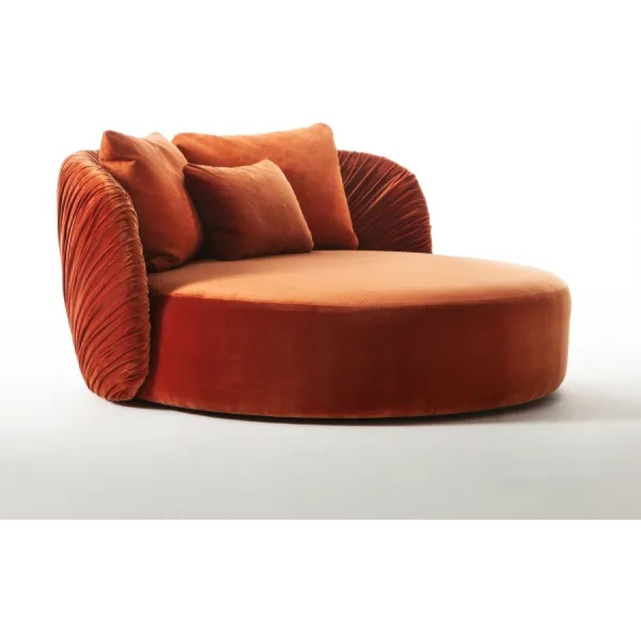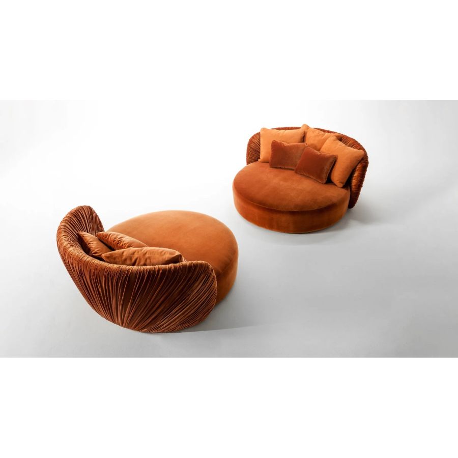 Round padded sofa, covered with a soft drapery. Equipped with wheels.