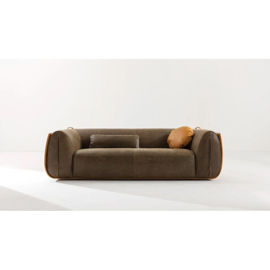 Padded sofa, available in the two or three-seater version, covered in a leather, velvet or fabric tailoring. Equipped with feet.