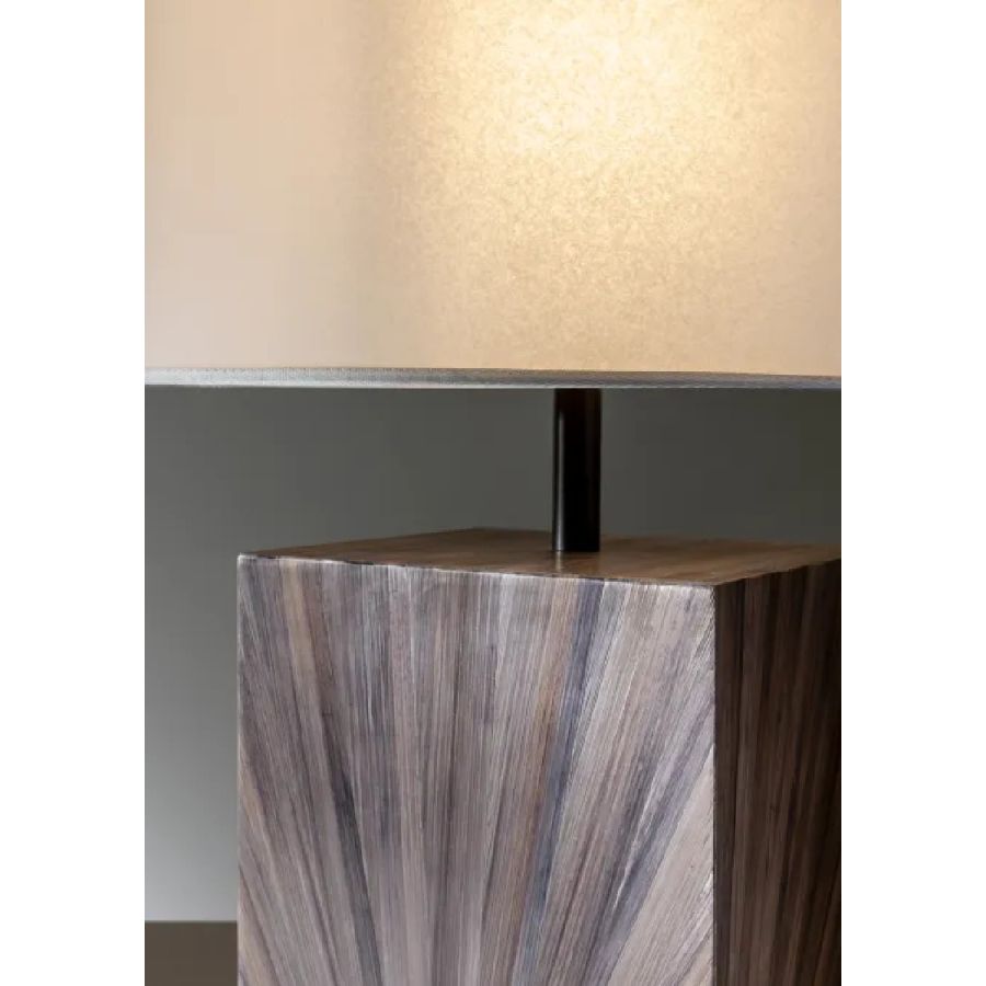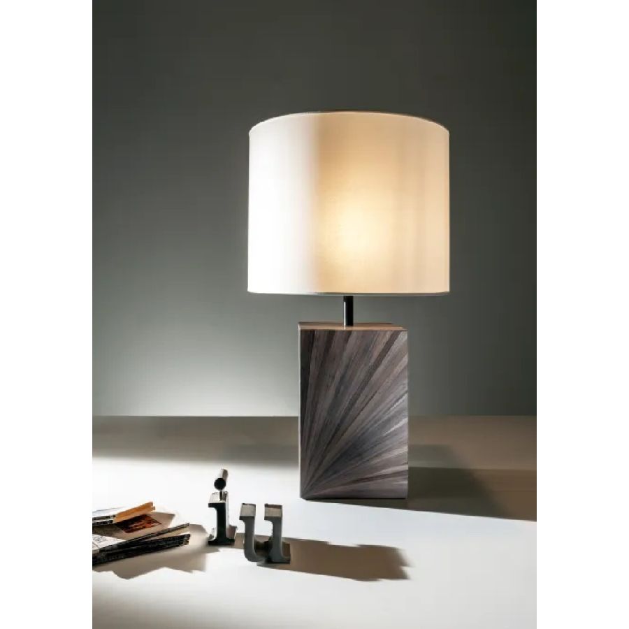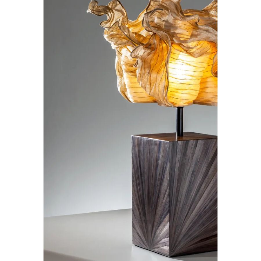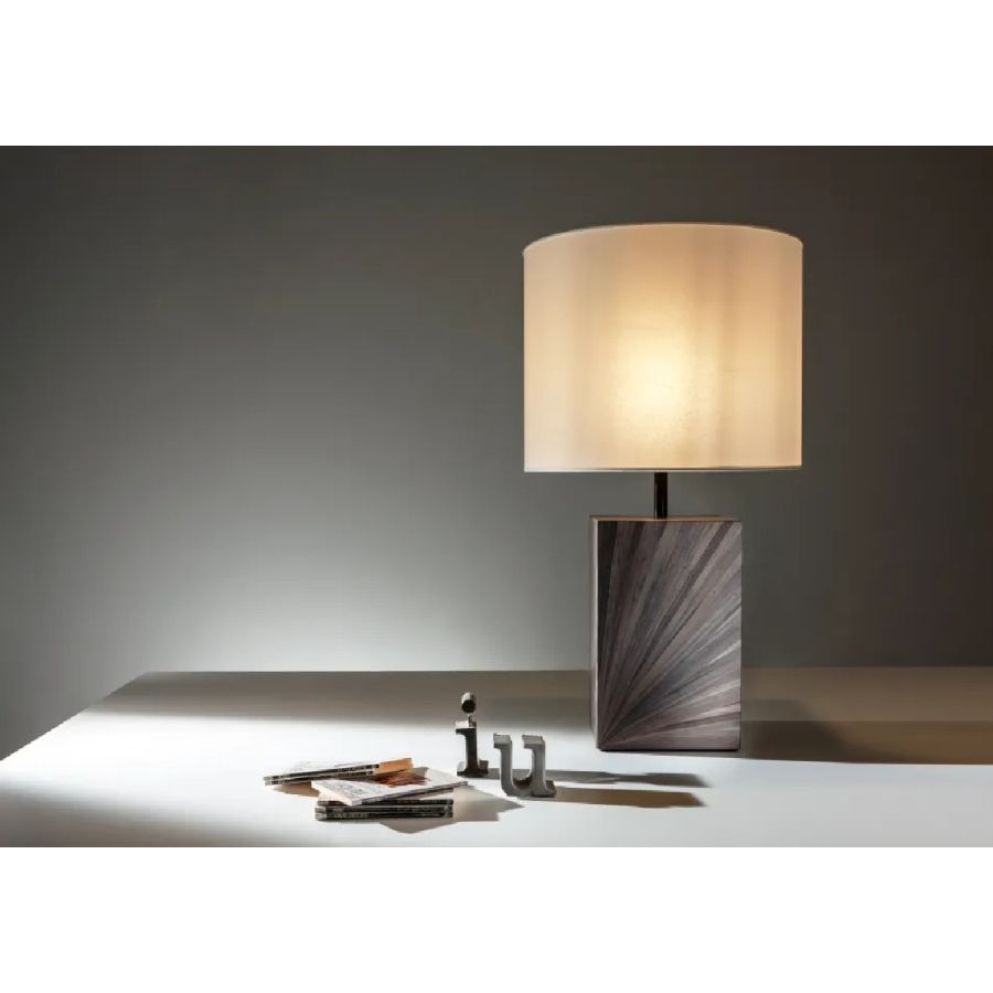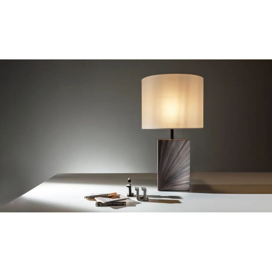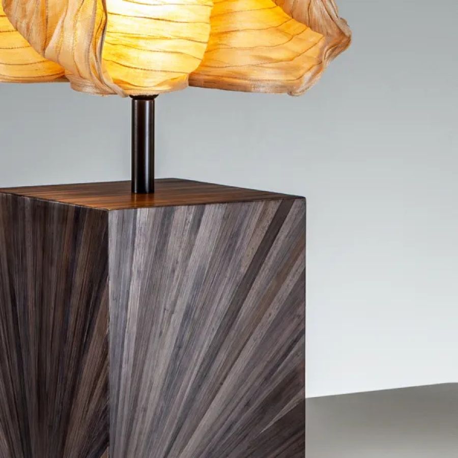 Table lamp with base in transparent glossy stained wood or decorated with a rye straw inlay.