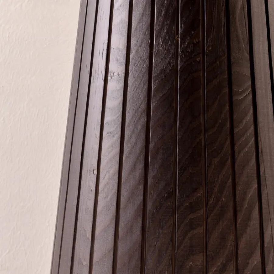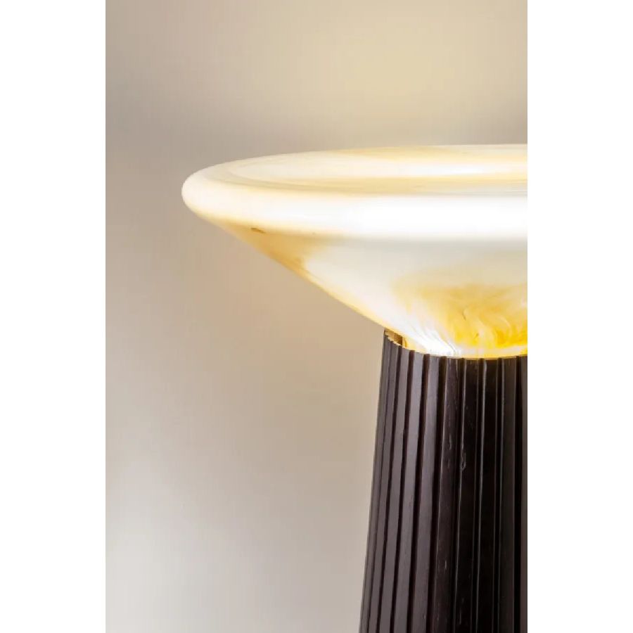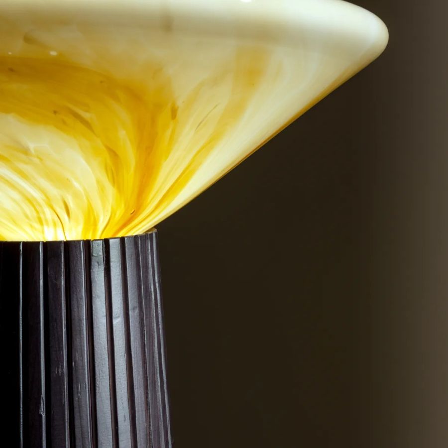 Table lamp consisting of a solid stained fir wood structure and with a sculptural lampshade in mouth-blown Murano glass.
