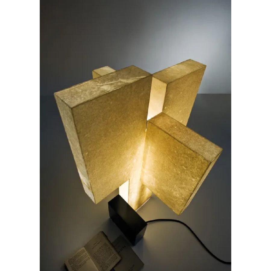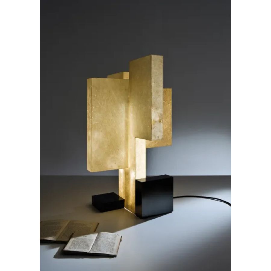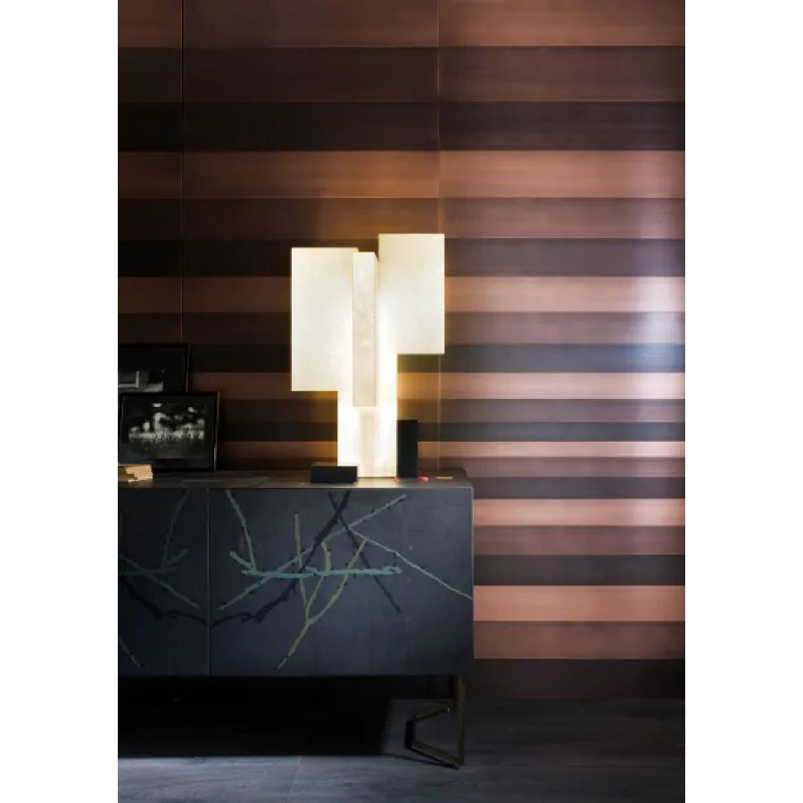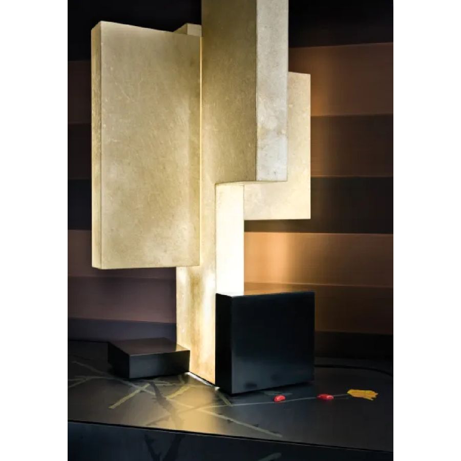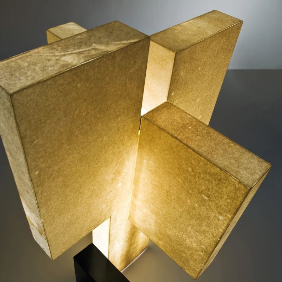 Table lamp with burnished brass base, diffuser covered in goat parchment and four internal LED strips.