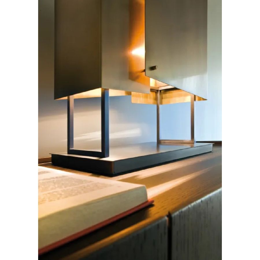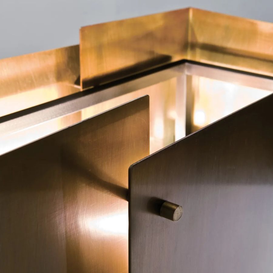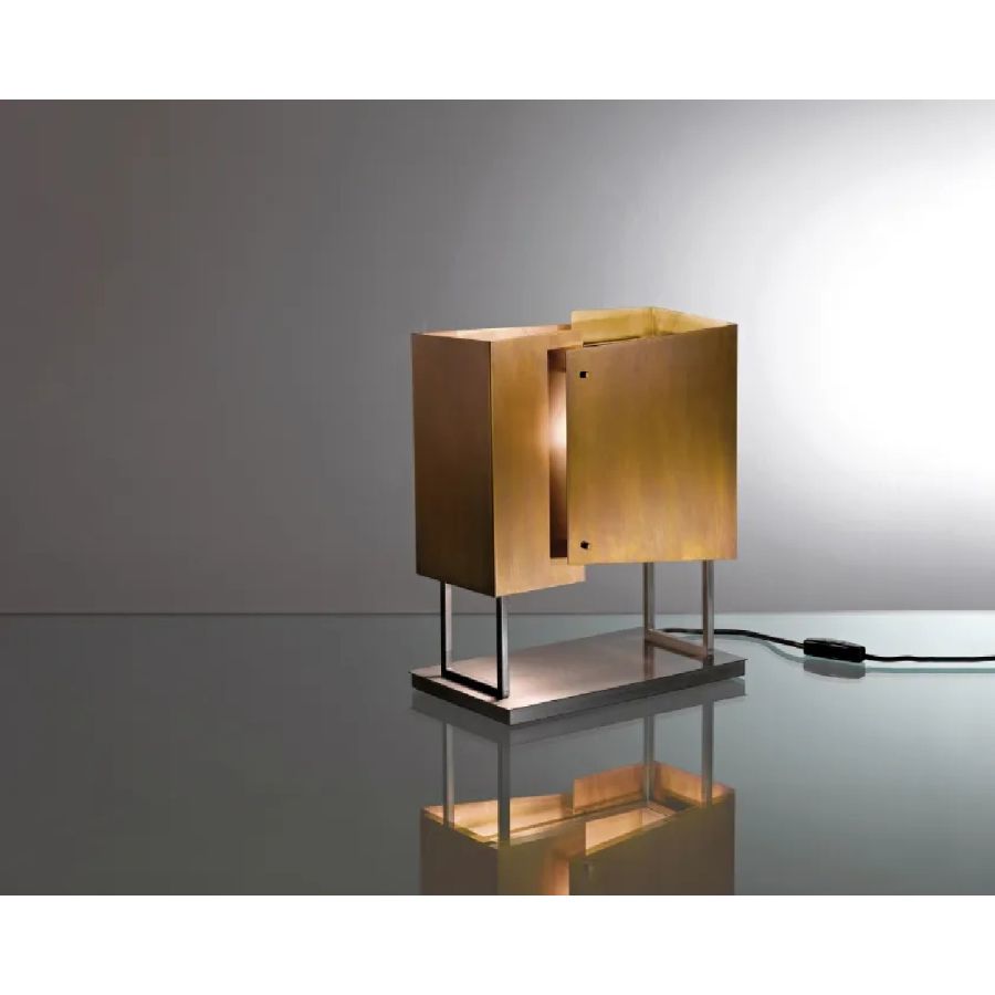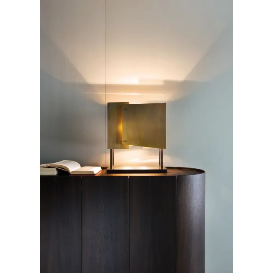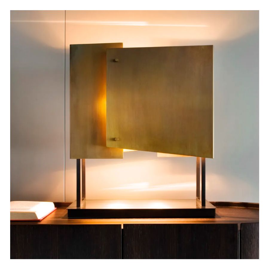 The meticulous attention to detail and the exclusive manual treatment of the burnished brass elevate the lamp, resulting in a highly ornamental piece.