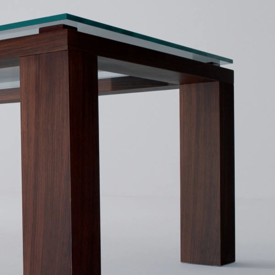 Customizable in all the wood essences of the collection, in dyed, lacquered or aniline-dyed wood. Available with protruding or corresponding to the base glass top.