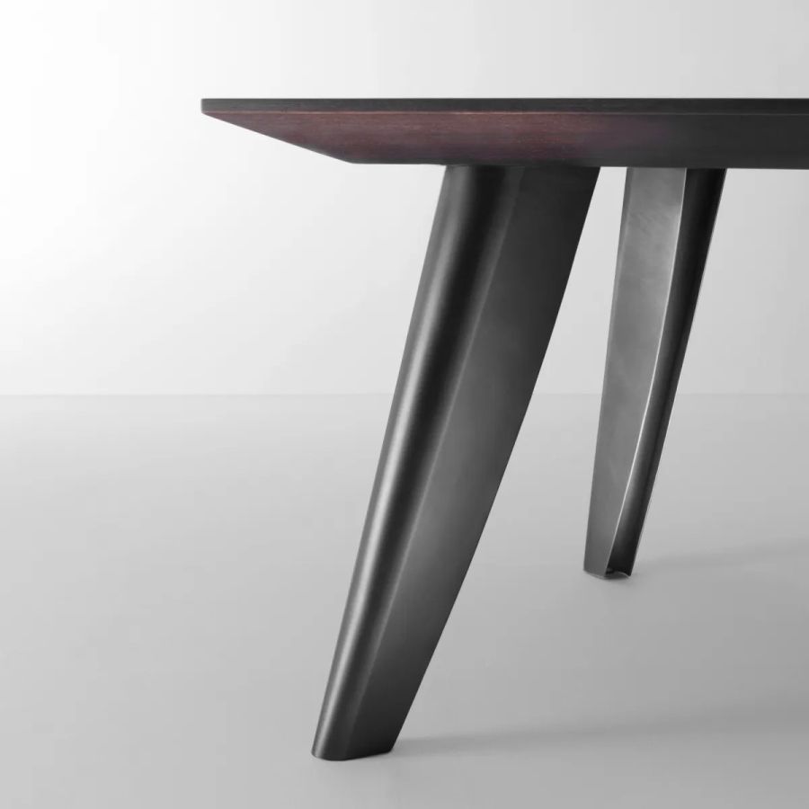 Rectangular, round, square or elliptical table, with wooden top and brass legs with bronze finish.