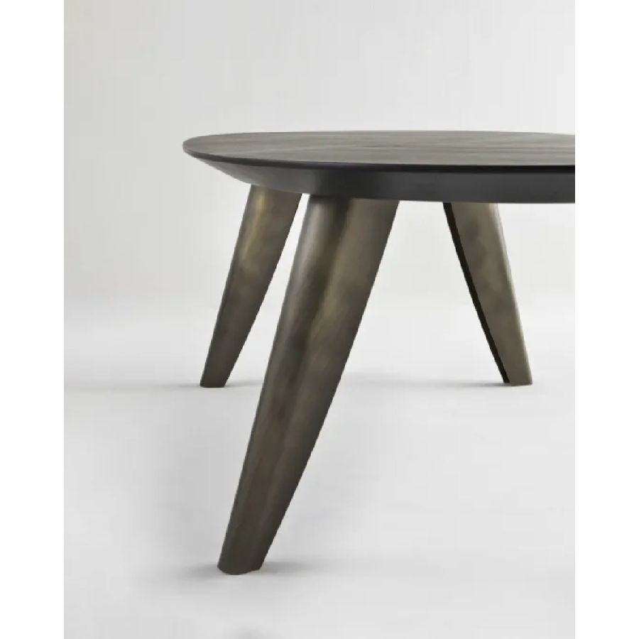Elliptical table with wood veneer top and brass legs with bronze finish.