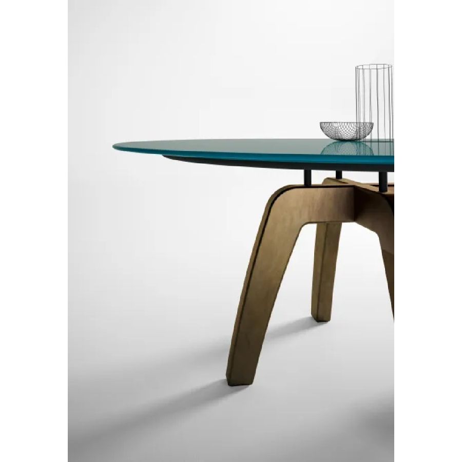 Round or rectangular table available in different sizes, with top decorated with a dyed wood insert. Legs in dyed wood.