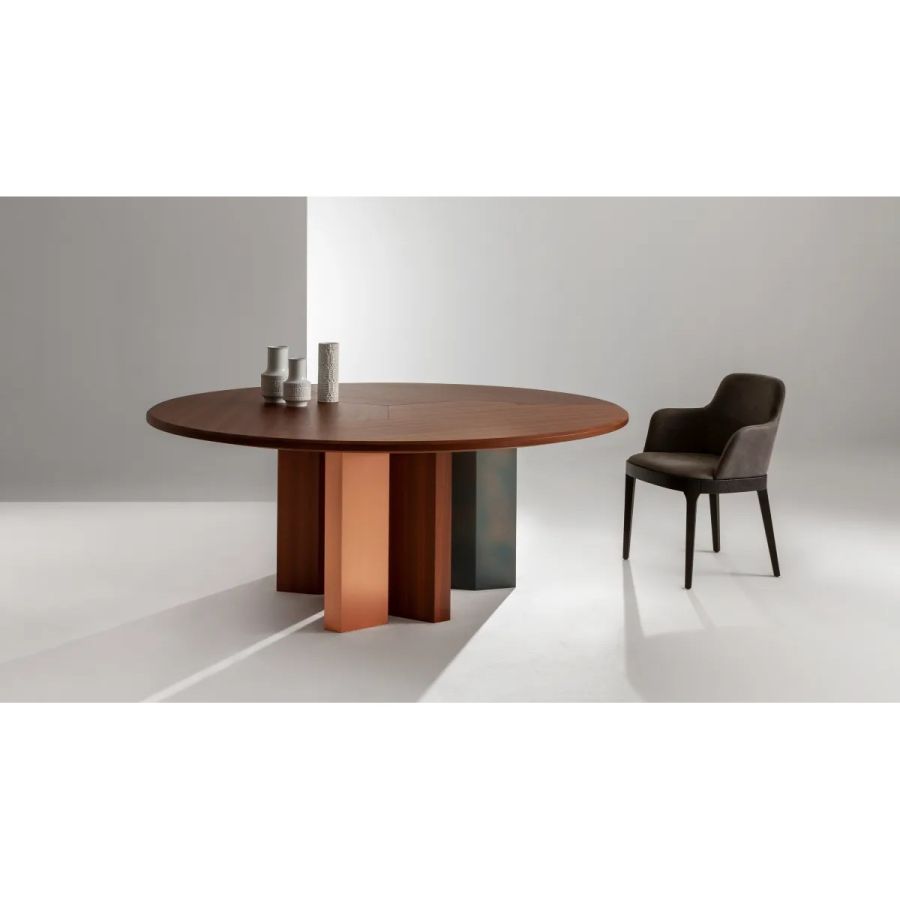 Round or rectangular table available in different dimensions, with top in wooden or marble modules and imposing prismatic base.