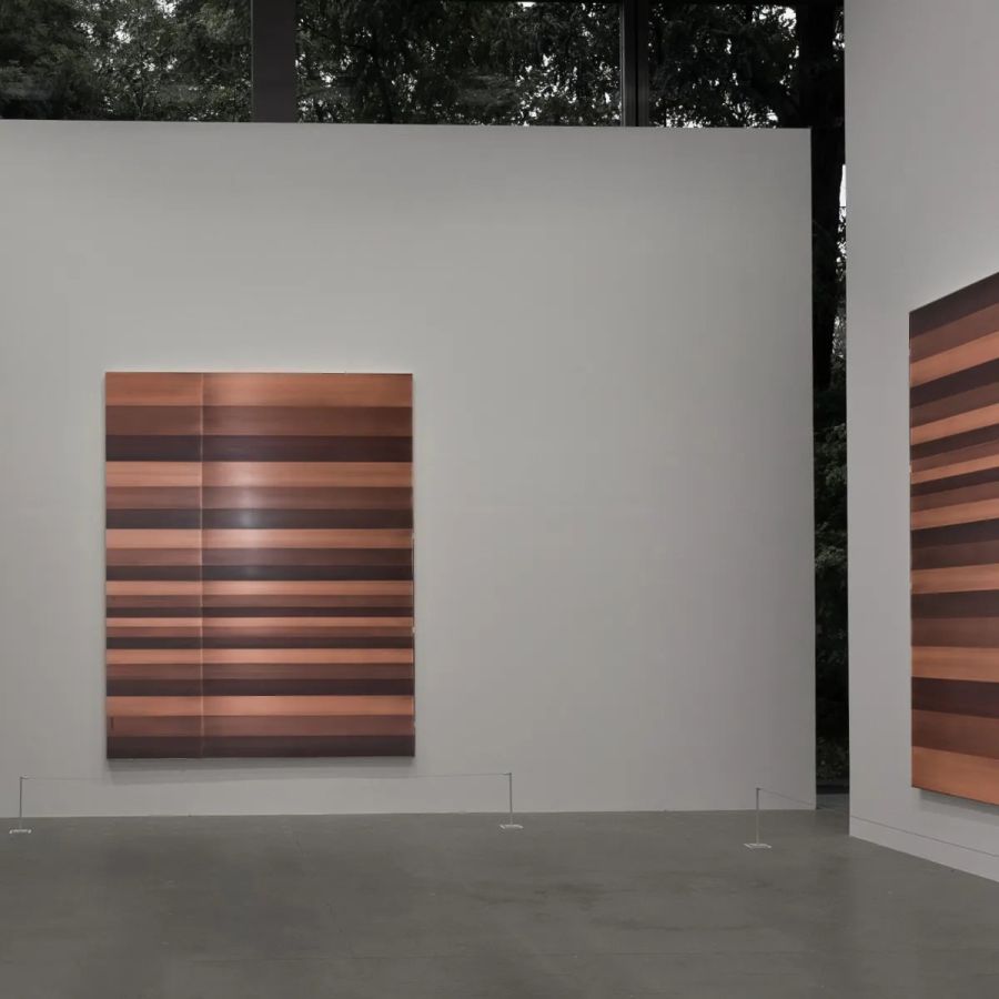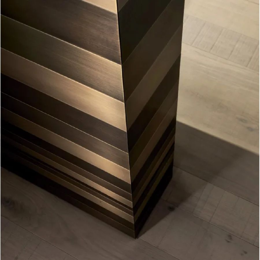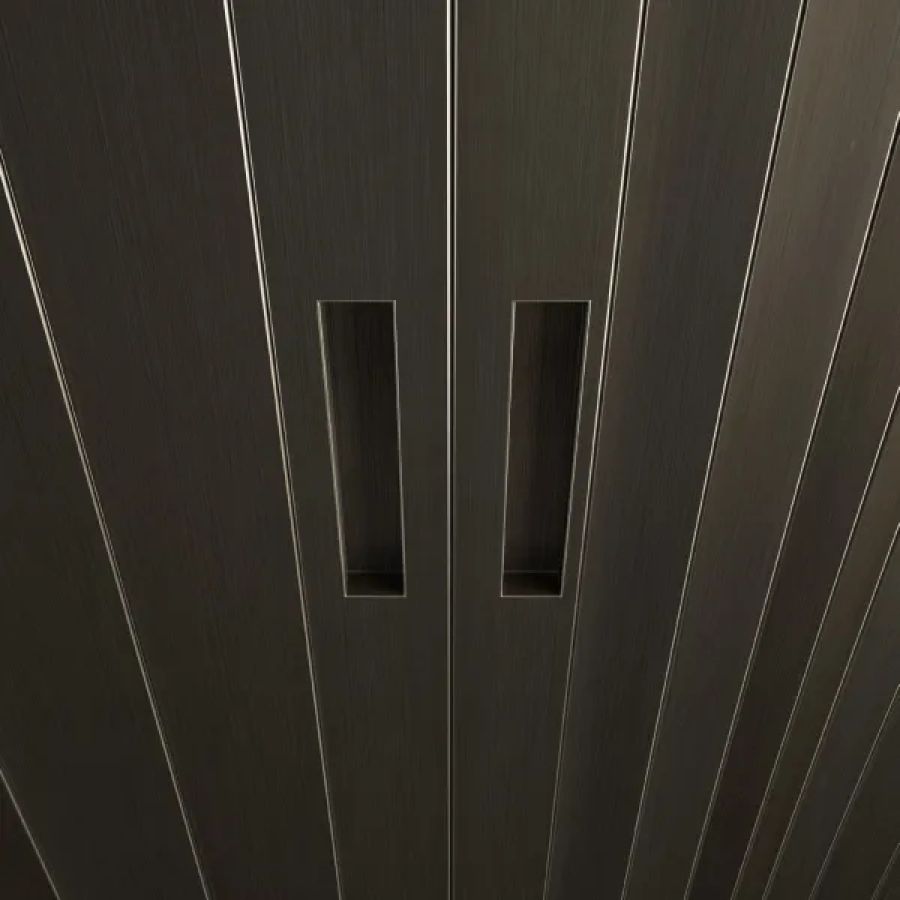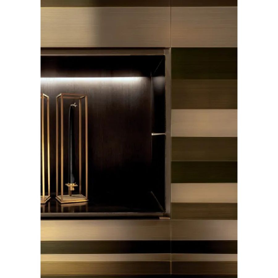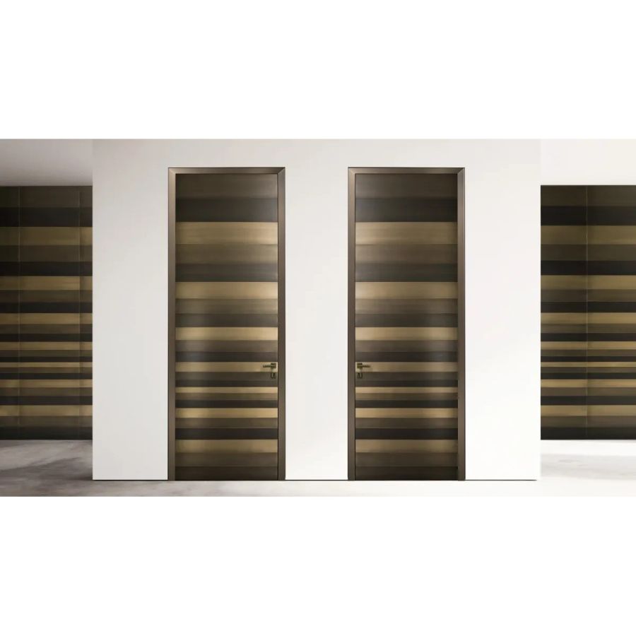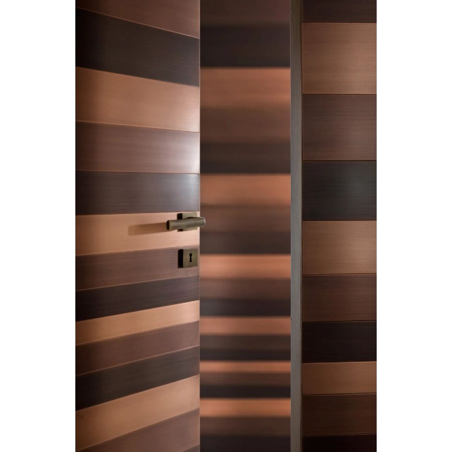 Made to measure wall panels in blockboard, covered on the visible side with 1 millimiter metal bands of different sizes.