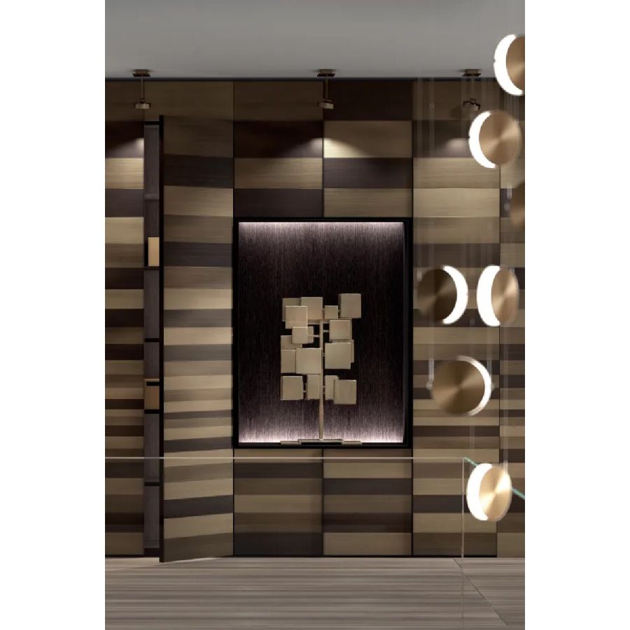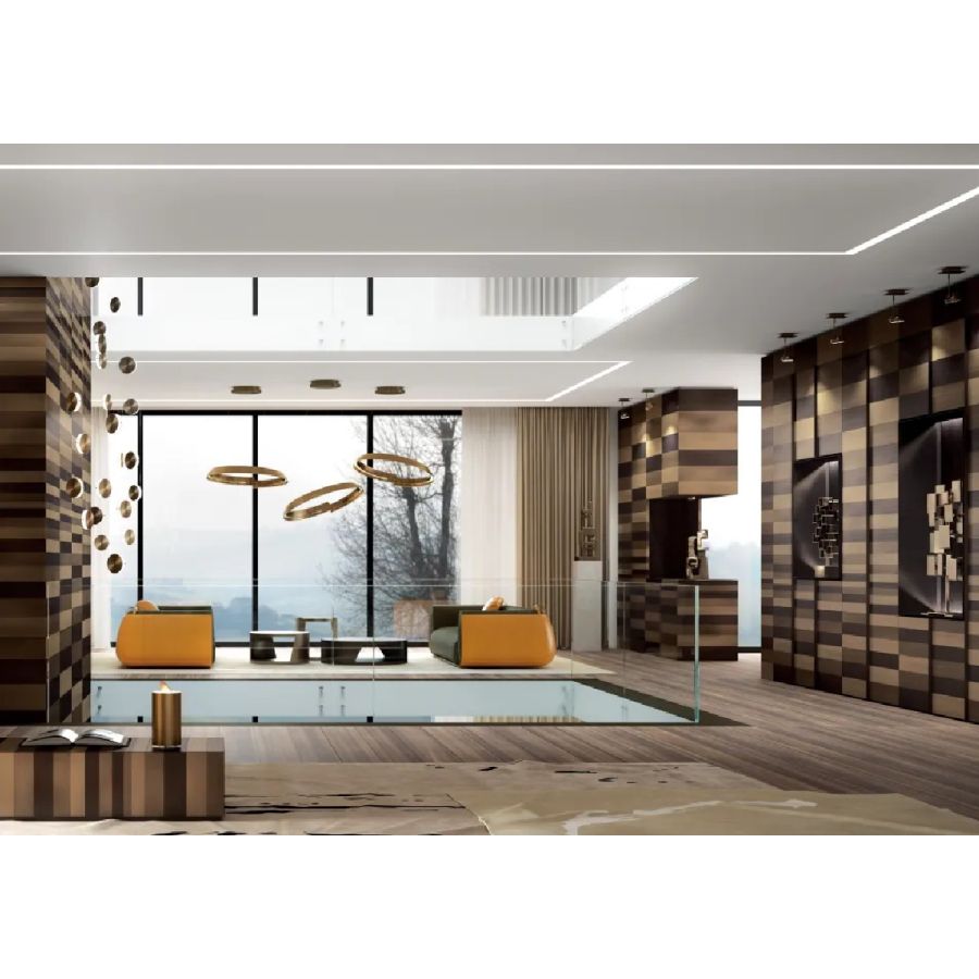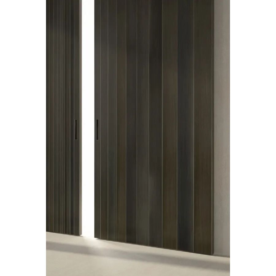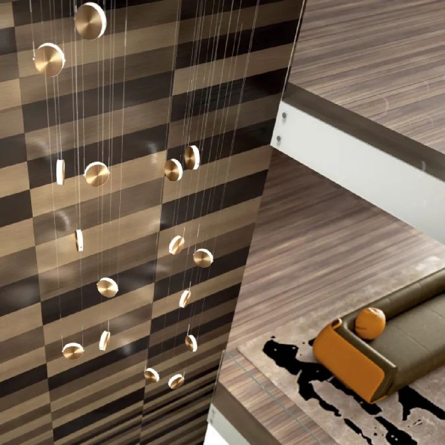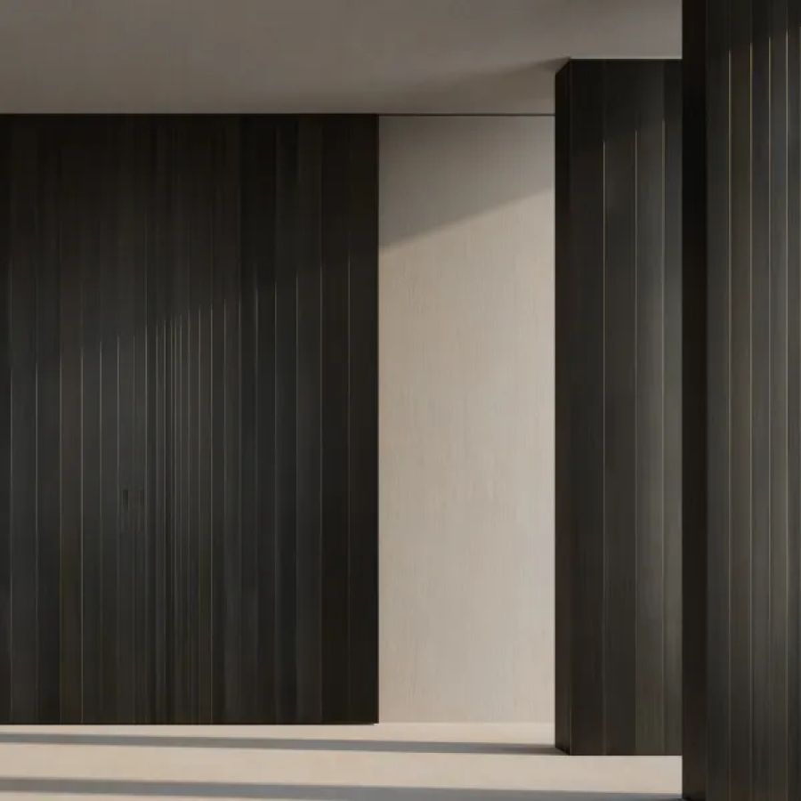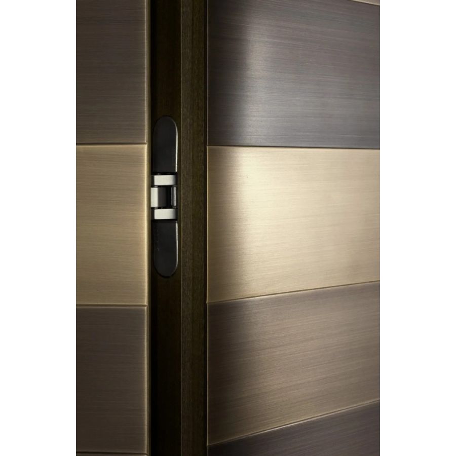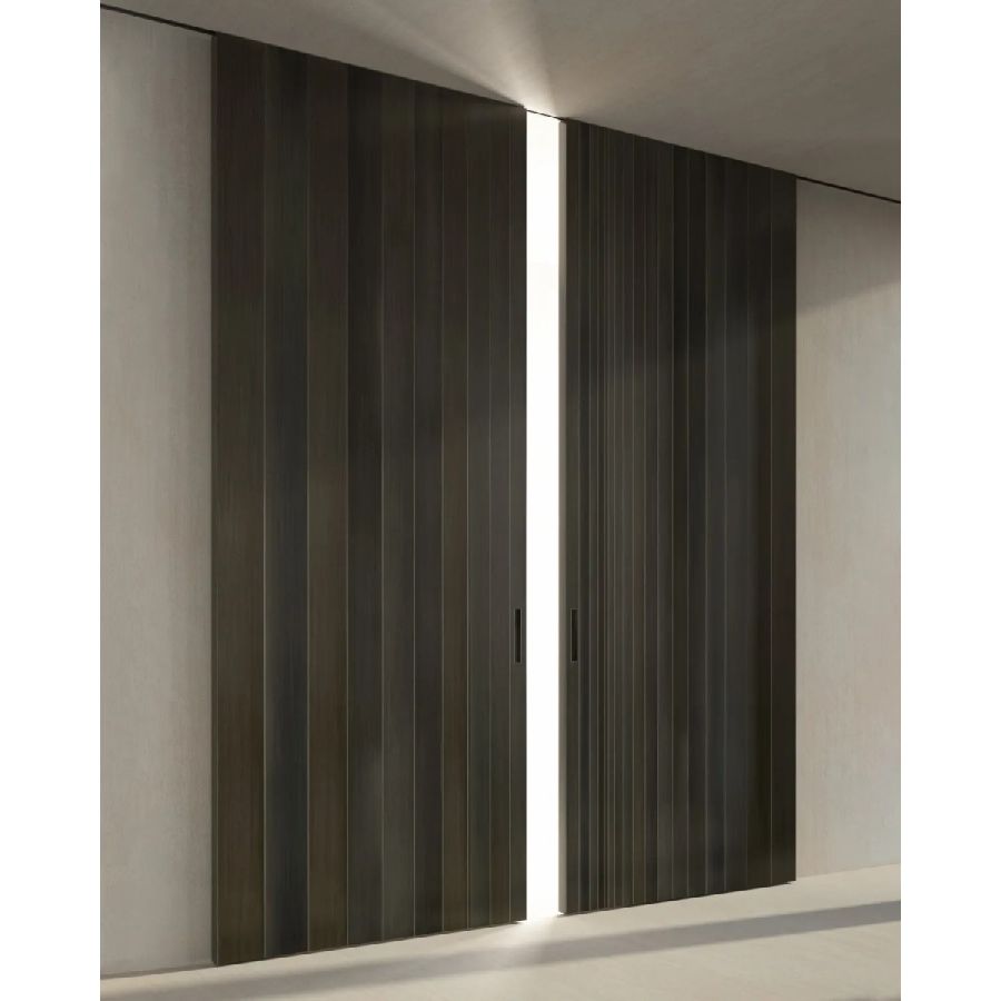 Made to measure wall panels in blockboard, covered on the visible side with 1 millimiter metal bands of different sizes.