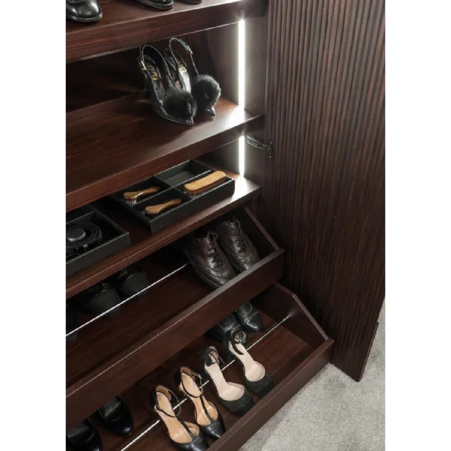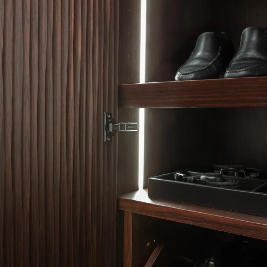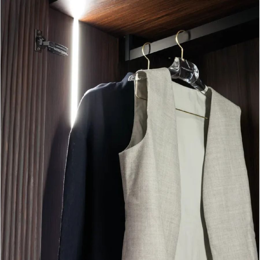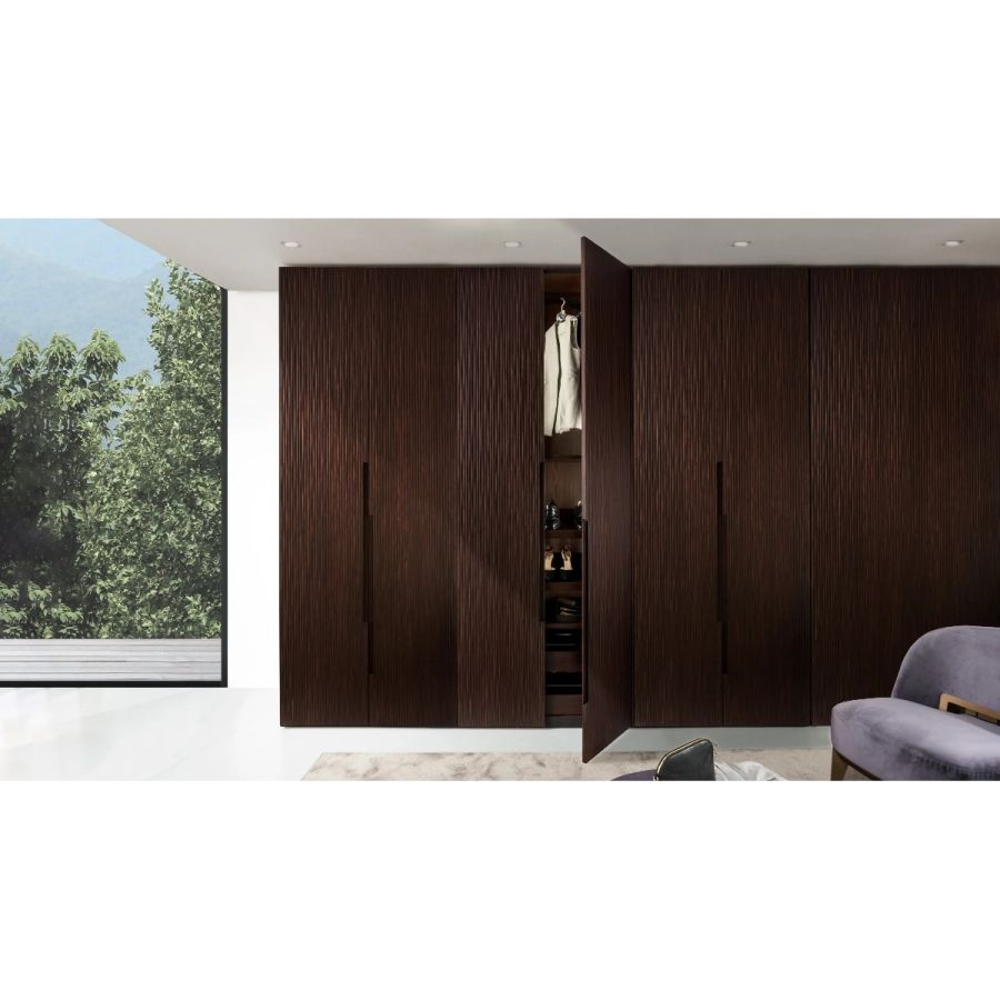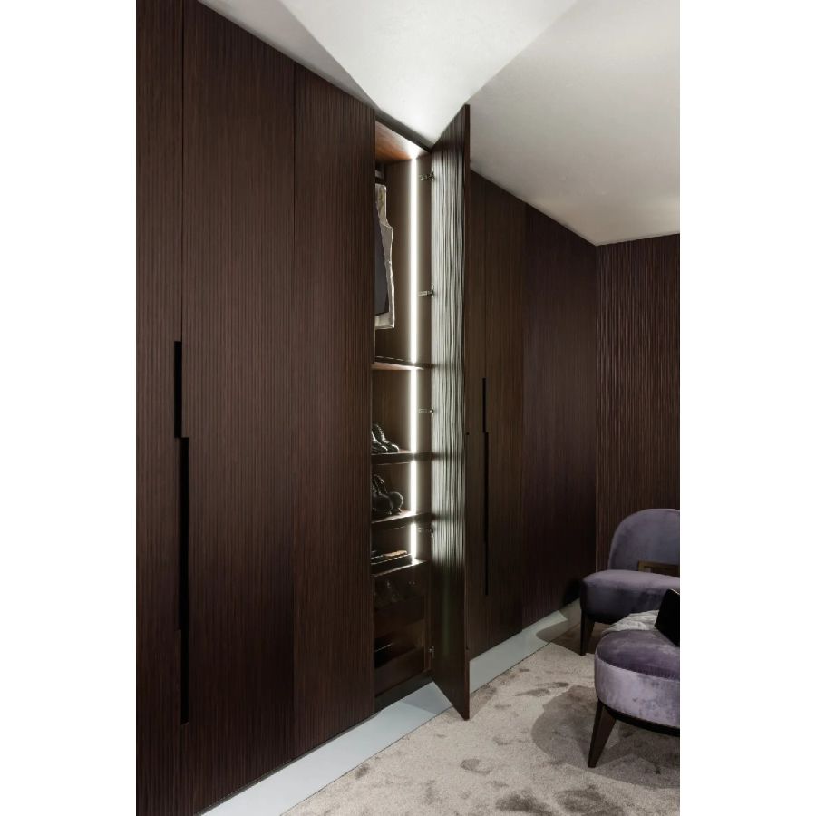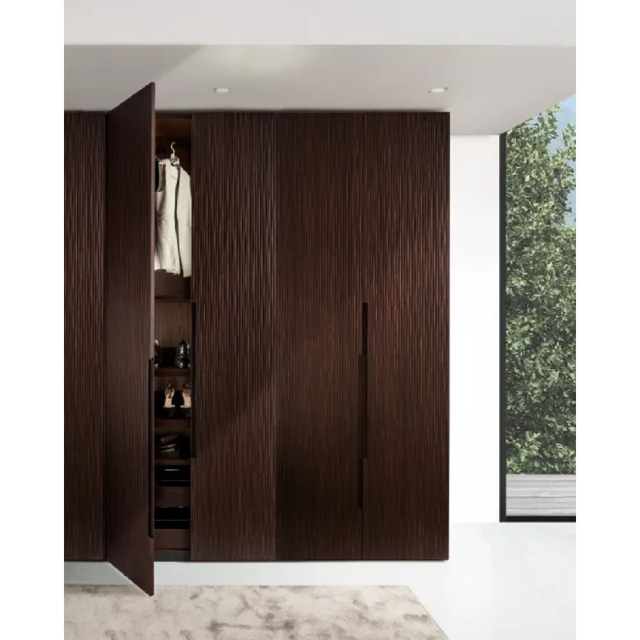 Made to measure wardrobe system with Onda carving, customizable in size and finishes. Available tailor-made with customizable accessories, equipment and internal finishes, and with integrated LED lighting.