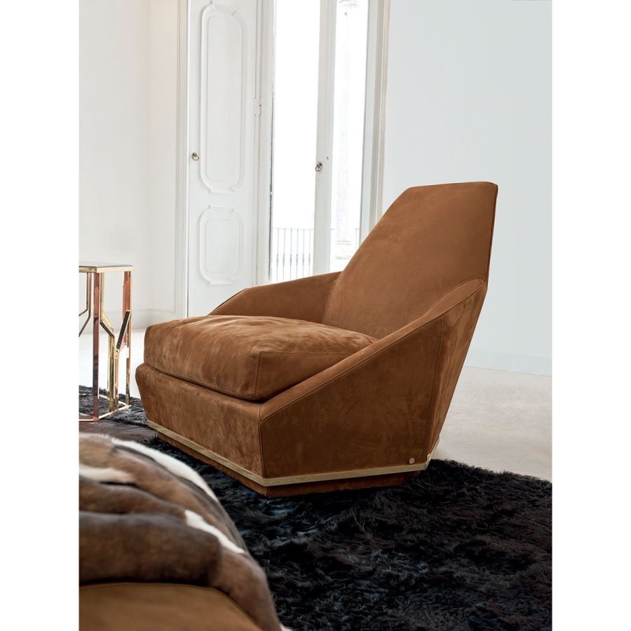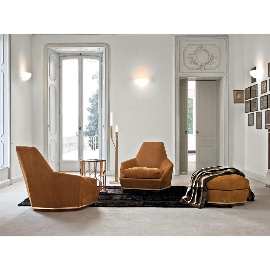 Wood frame with elastic bands, covered in high-density, multi-thickness polyurethane foam. Seat cushions in sterilised goose down with insert in multi-thickness polyurethane foam with reinforcement in “Visco Soft”. Wood base covered in the same material as the upholstery. Iron finishing ring on the base available in the finishes: Satin nickel, bright shaded brown, Black Rose gold, bright light gold, matt Champagne gold, bright chrome, bright black chrome, matt satin bronze, bright pink gold, matt pink gold. Given the particular process, the leather or fabric cover of the frame is not removable, but the fabric seat cushion cover can be removed.
