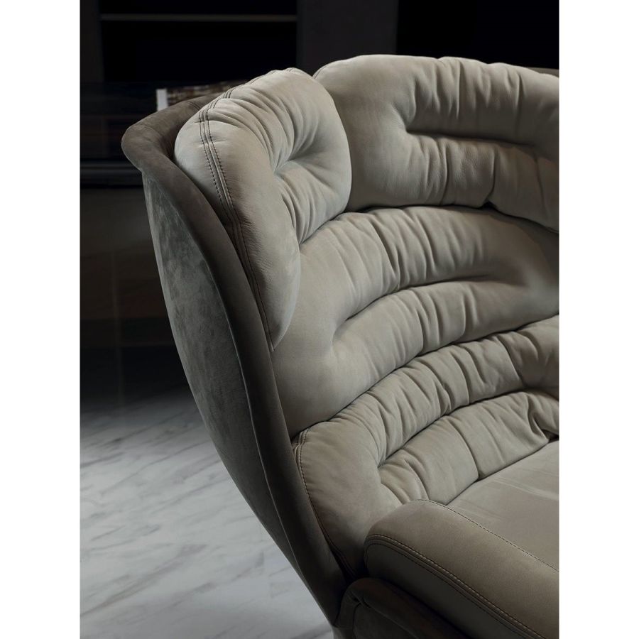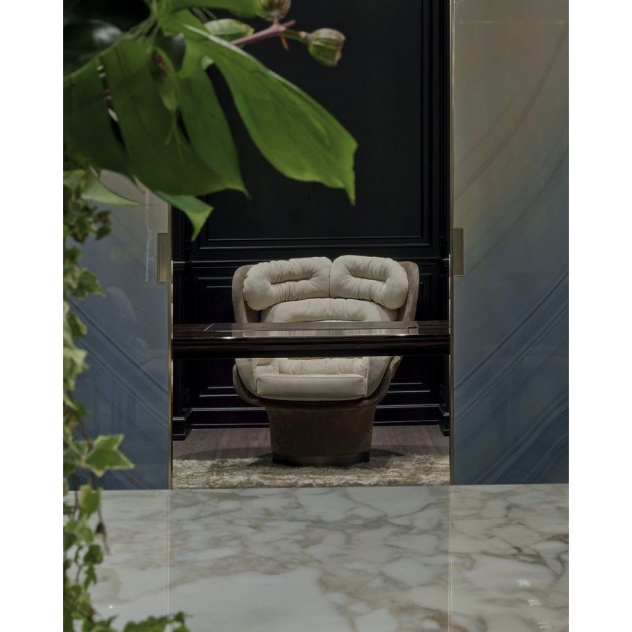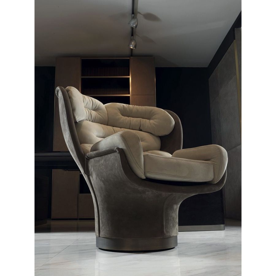 Armchair from the original design by Joe Colombo, slightly modified to allow correct use at a desk. Backrest cushions are more padded, and the seat was raised. The base is mobile and swivels on two wheels.Fiberglass frame made as in the original design, in moulds with a completely hand work. Cushions in anatomical polyurethane foam covered in Dacron. The external fiberglass structure can be covered in leather, or painted in the following finishes: glossy white, glossy black, metallic bronze, metallic grey, or metallic blue. Metal ring located at the base available in the following finishes: Satin nickel, bright shaded brown, Black Rose gold, bright light gold, matt Champagne gold, bright chrome, bright black chrome, matt satin bronze, bright pink gold, matt pink gold. Given the special manufacturing process, fabric or leather upholstery is not removable.
