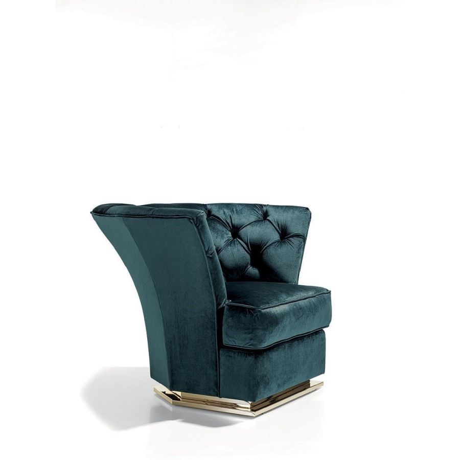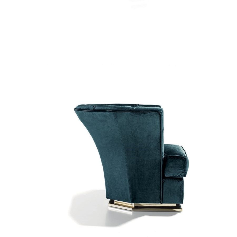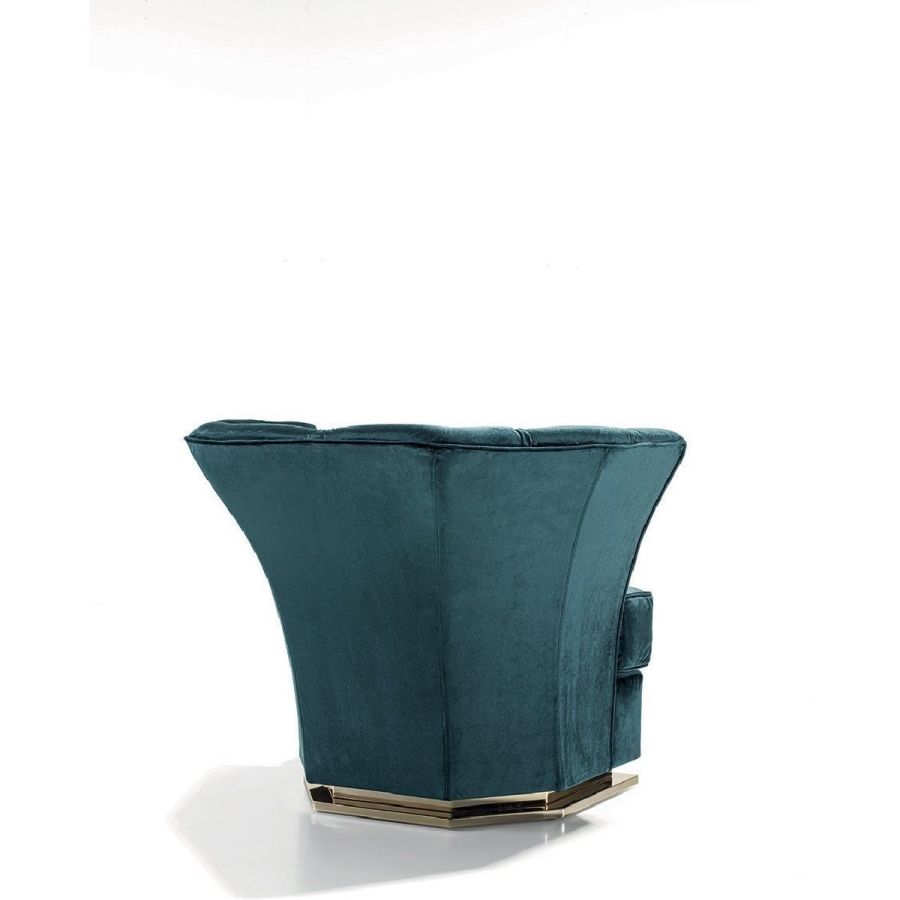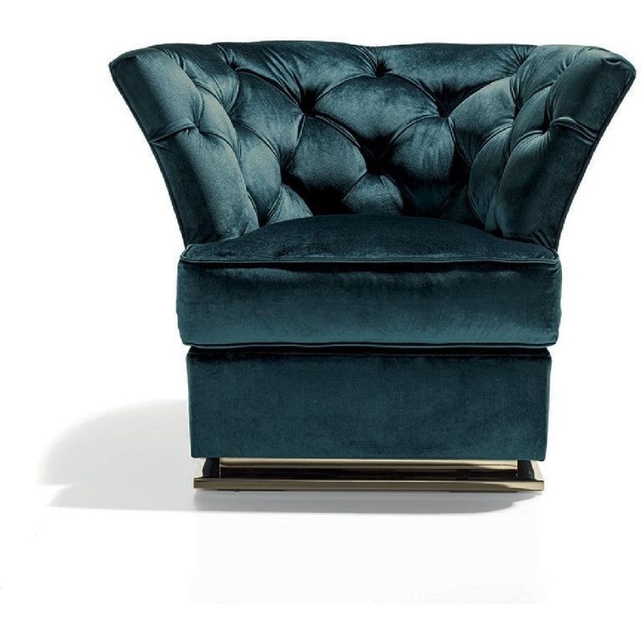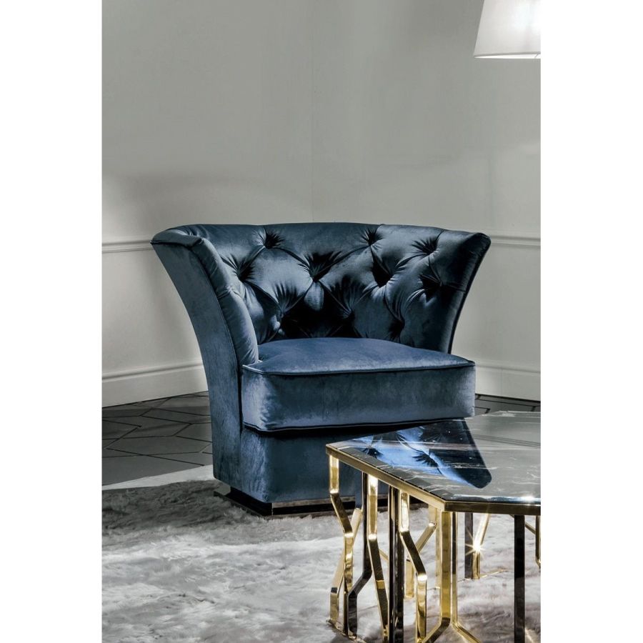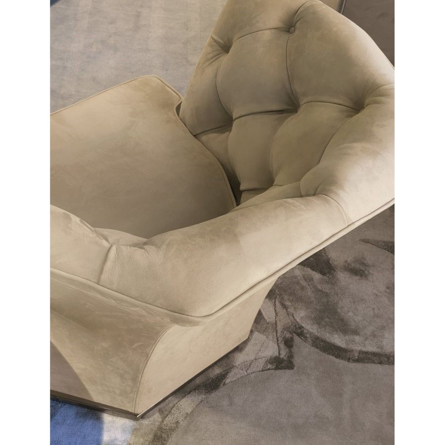 Frame in wood with elastic bands, covered in multithickness polyurethane foam. Seat cushion in sterilised goose down with insert in multi-thickness polyurethane foam. The internal cover has a “Capitonné” pattern, with buttons in plain colour. Given the special manufacturing process, fabric or leather upholstery is not removable. Metal base in the following finishes: Satin nickel, bright shaded brown, Black Rose gold, bright light gold, matt Champagne gold, bright chrome, bright black chrome, matt satin bronze, bright pink gold, matt pink gold.