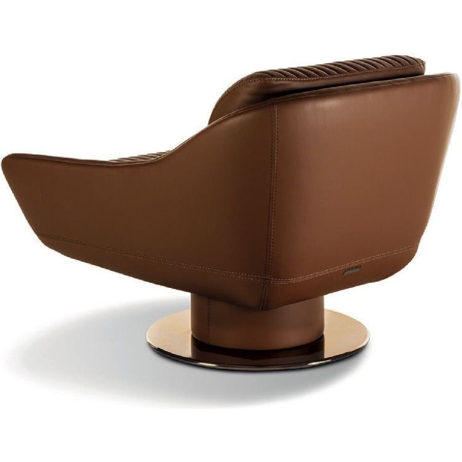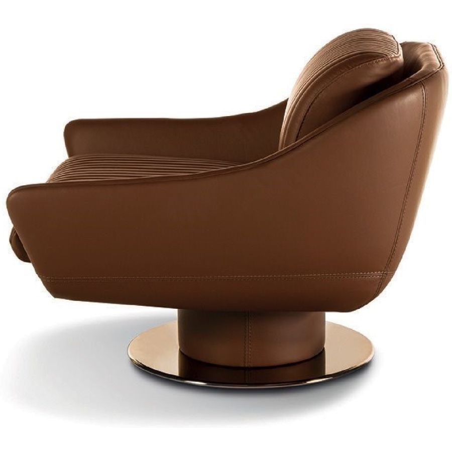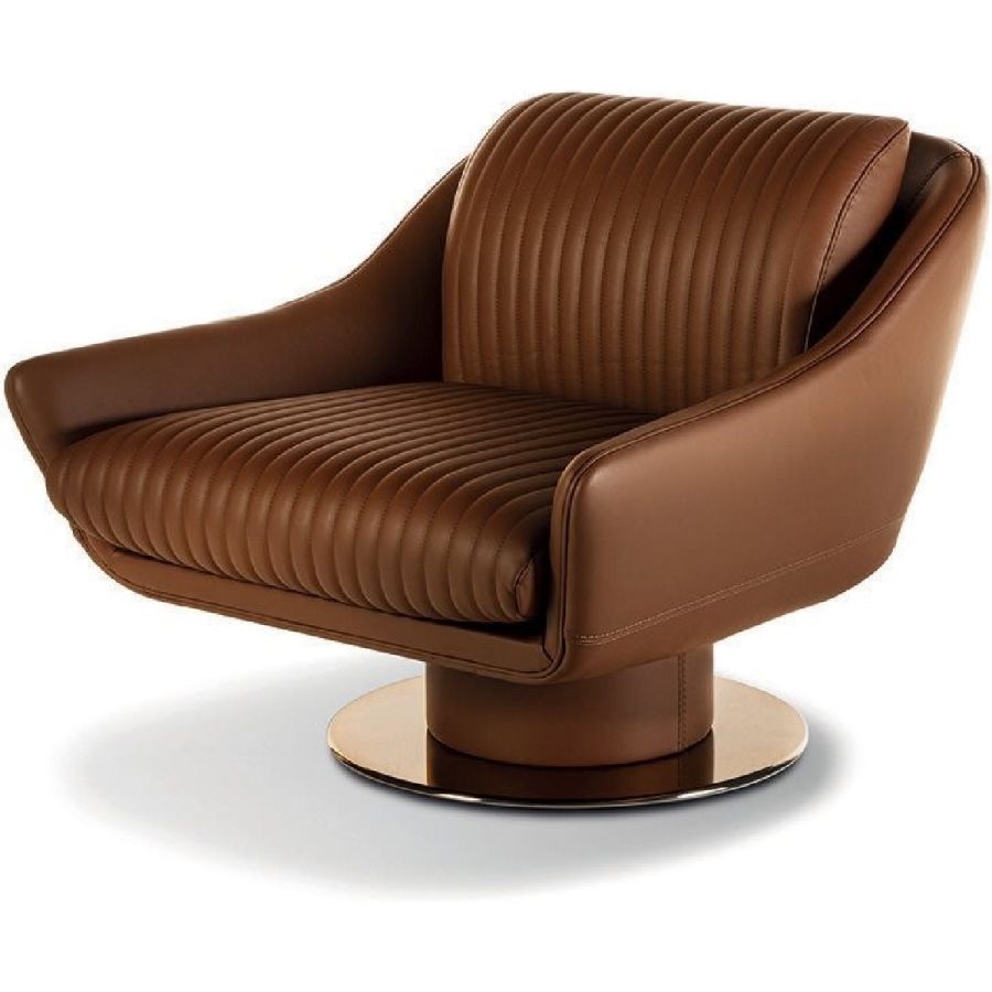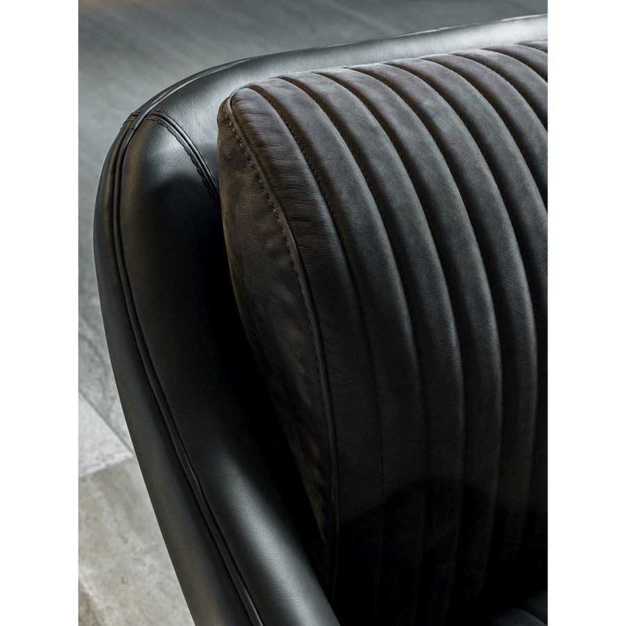 The design plays aesthetically on the combination of materials. Smooth leather follows the curve of the contoured backrest and gradually becomes the armrest. And the ribbed, quilted seat adds precious volume. A sophisticated aesthetic language is expressed through soft forms and details with strong visual impact, such as the metal base with leather-covered cylinder and self-aligning 360° swivel mechanism.