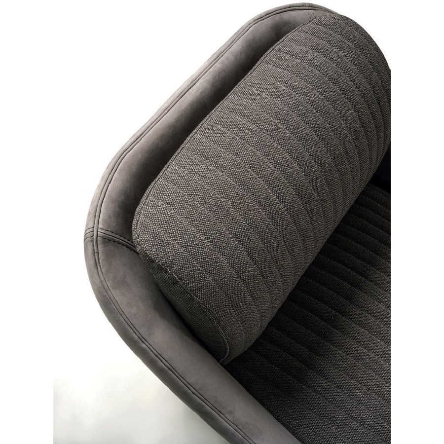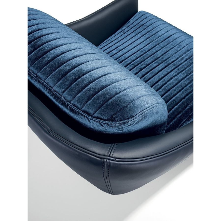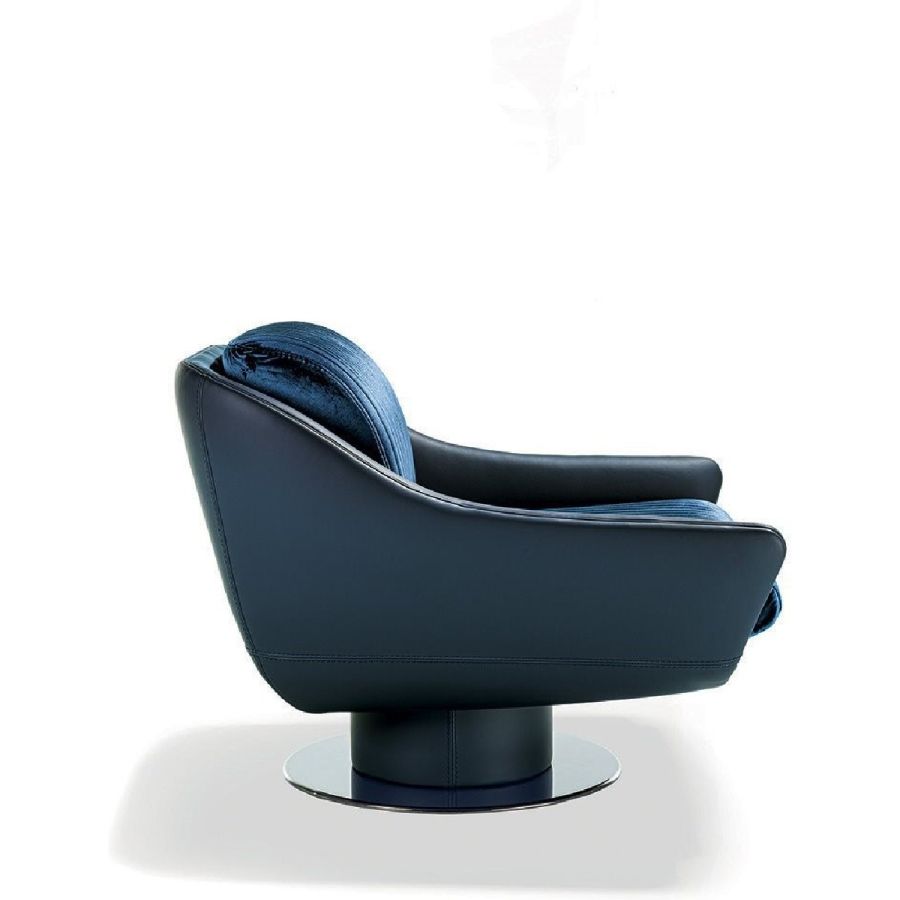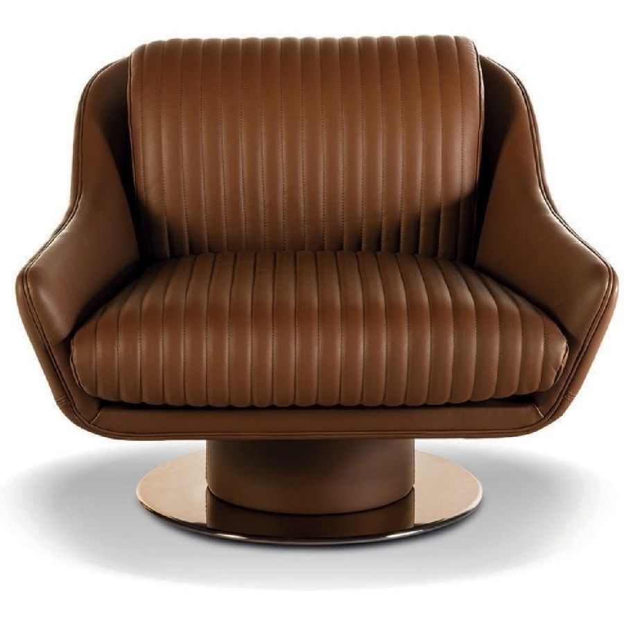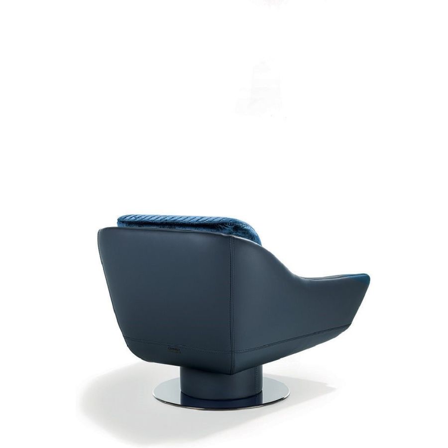 The design plays aesthetically on the combination of materials. Smooth leather follows the curve of the contoured backrest and gradually becomes the armrest. And the ribbed, quilted seat adds precious volume. A sophisticated aesthetic language is expressed through soft forms and details with strong visual impact, such as the metal base with leather-covered cylinder and self-aligning 360° swivel mechanism.