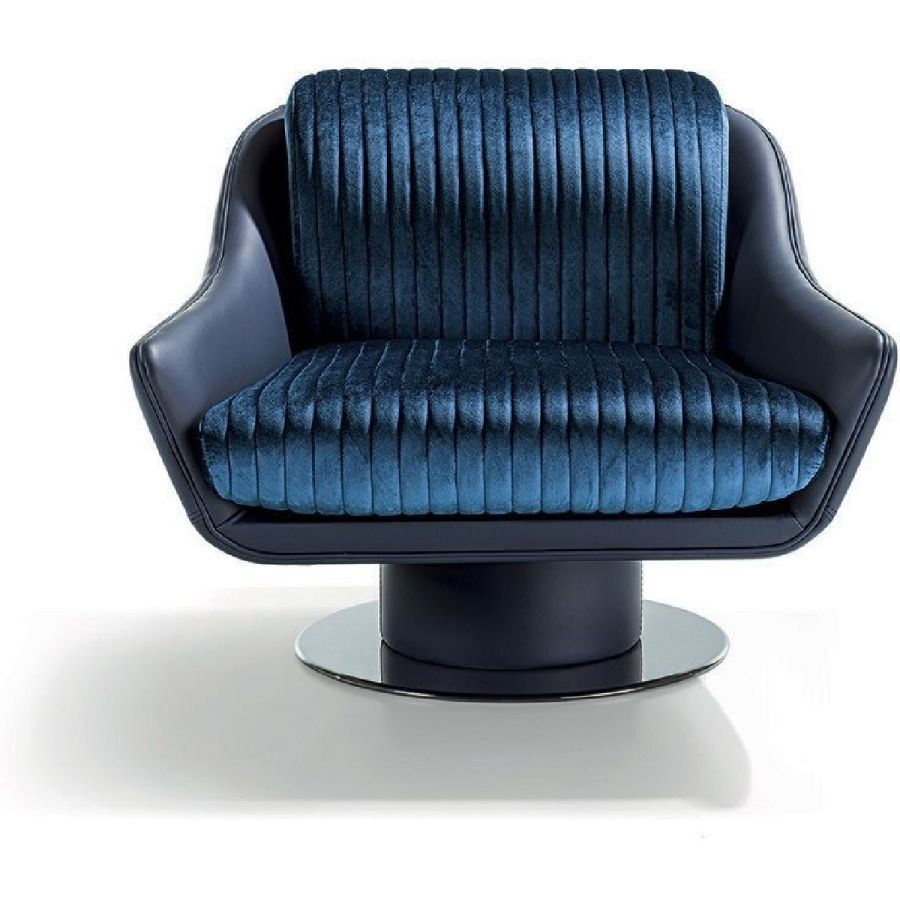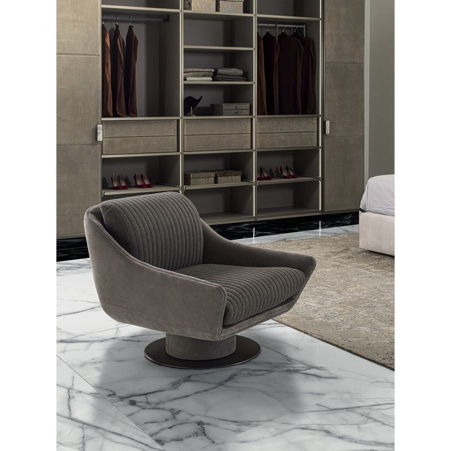 Frame in wood covered in high density polyurethane foam. Seat and backrest cushions in medium/firm polyurethane foam with ribbed quilting. Base with wood frame covered in the same upholstery as the armchair, containing a fully rotational swivel pin with self-aligning mechanism. The base is in laser cut metal in the finishes: Satin nickel, bright shaded brown, Black Rose gold, bright light gold, matt Champagne gold, bright chrome, bright black chrome, bright pink gold, matt pink gold, painted bronze. Given the particular assembly of the product, the upholstery is not removable.