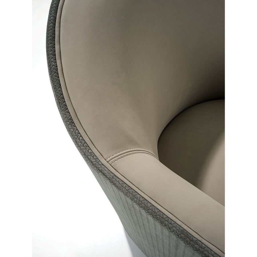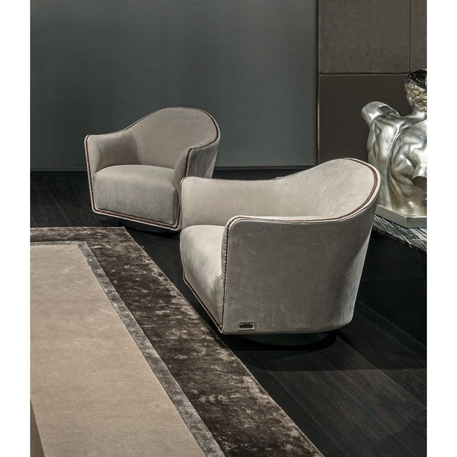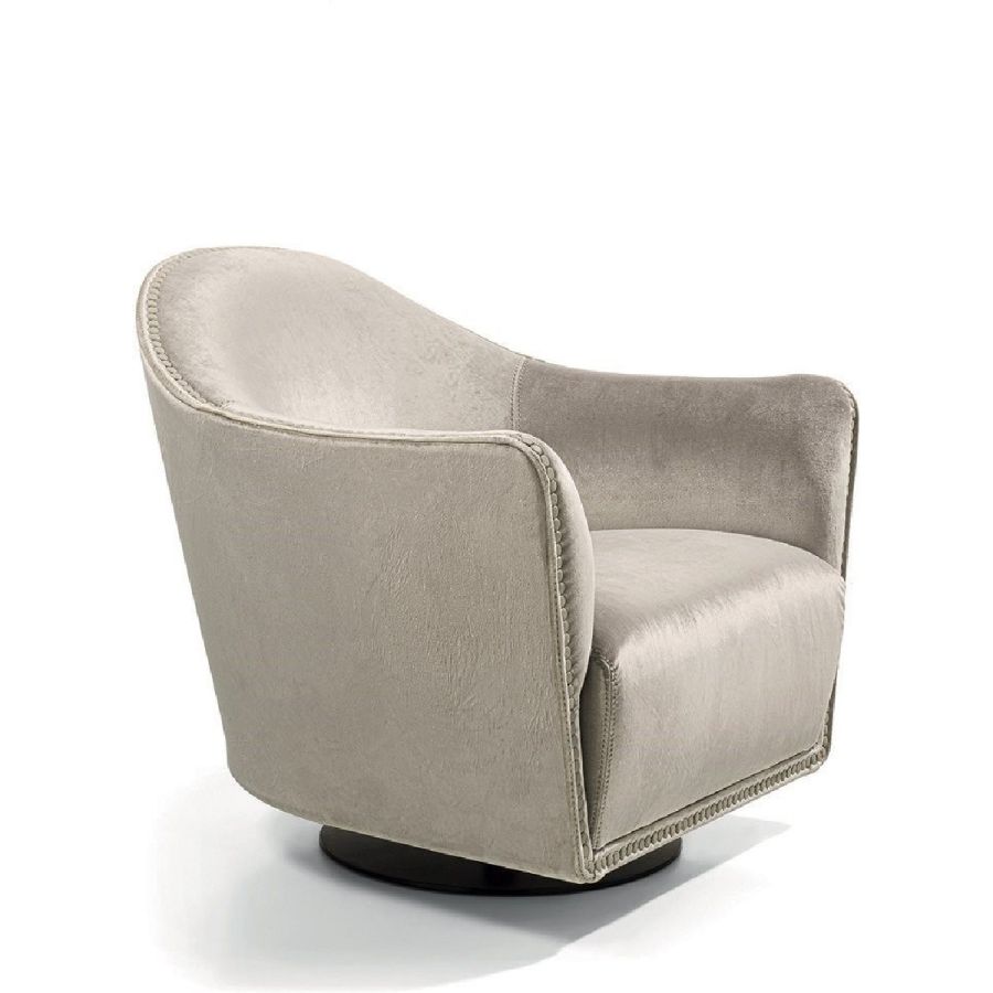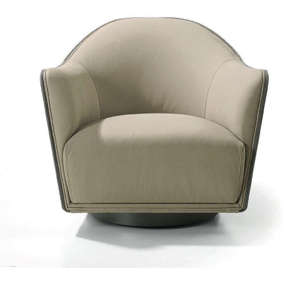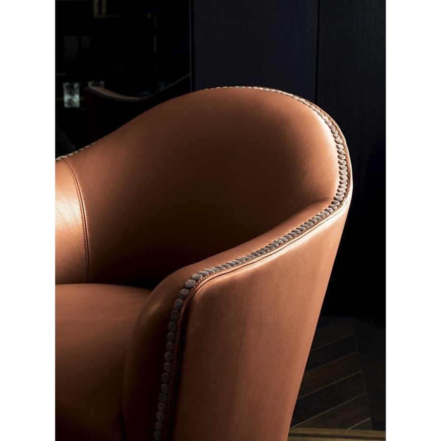 An elegant, round and decisively curvy compact armchair, that sets on a swivel base. Vivienne has a char-acteristic profile decorated with a line of leather-covered buttons running along the perimeter that un-derscore the design.
