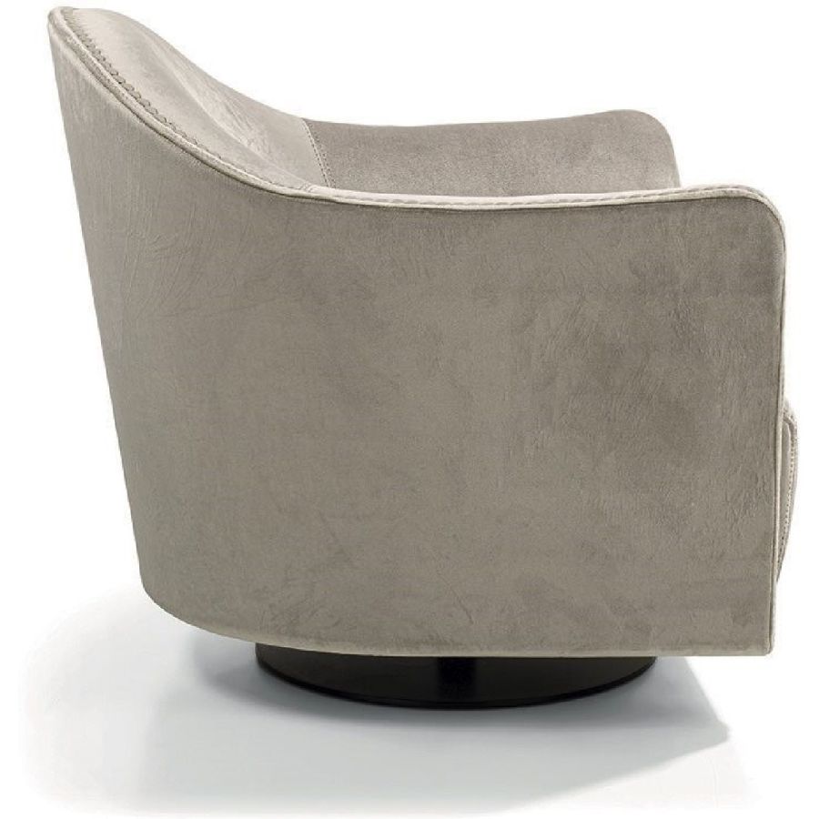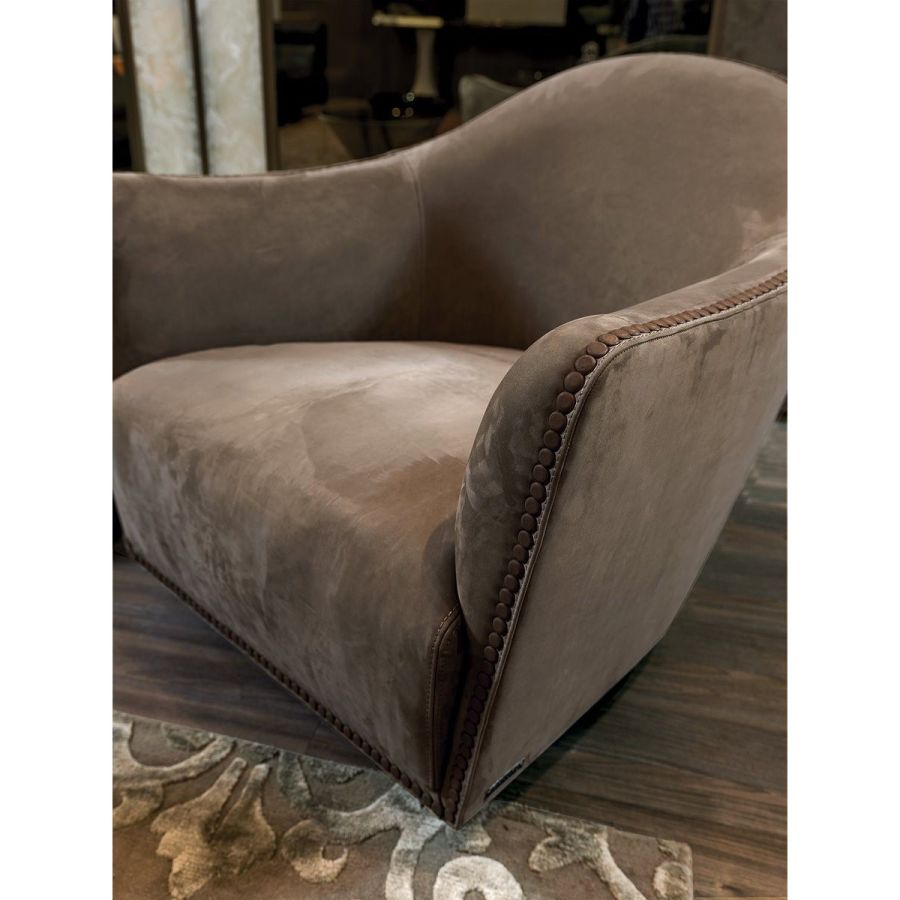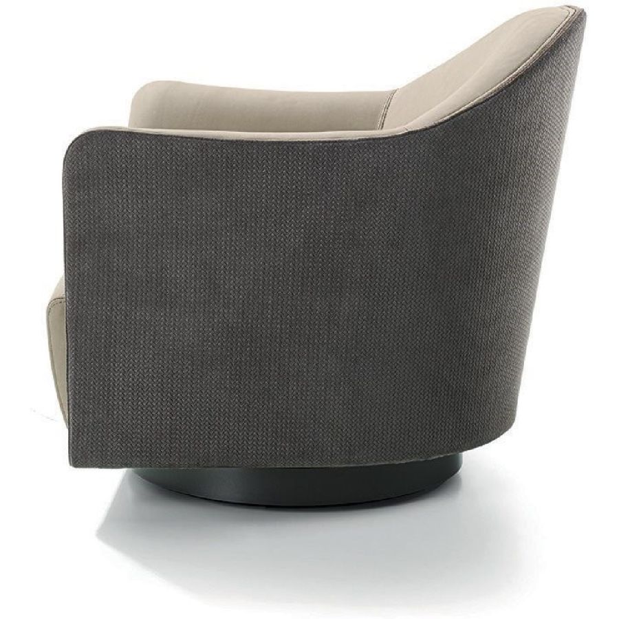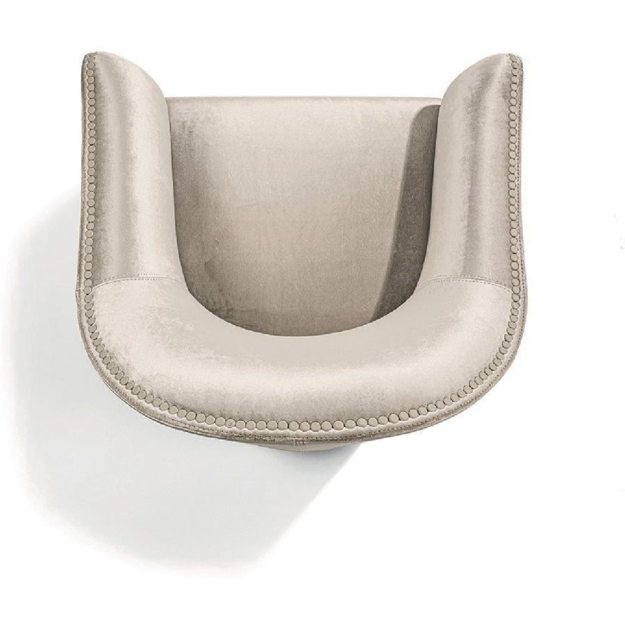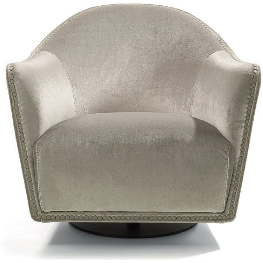 An elegant, round and decisively curvy compact armchair, that sets on a swivel base. Vivienne has a char-acteristic profile decorated with a line of leather-covered buttons running along the perimeter that un-derscore the design.