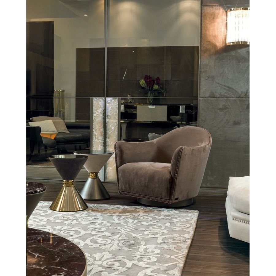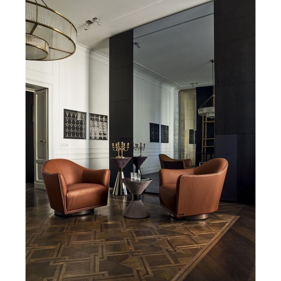 Swivel armchair (full 360° rotation) with leather or fabric upholstery, available with matching or two-tone profile or finished with visible buttons positioned manually and individually, in the finishes: bright chrome, matt black, bright light gold or matt antiqued gold, or covered in leather and, when possible, in velvet. The structure is in beech and fir plywood with high-resistance elastic bands, covered in high density polyurethane foam. The seat cushion is in multi-density polyurethane foam with rounded Memory Foam surface for better resistance to crushing over time, covered with a soft quilt of sterilised goose down. A painted bronze metal ring is placed on the base. Given the special manufacturing process, the upholstery on the seat and structure is not removable