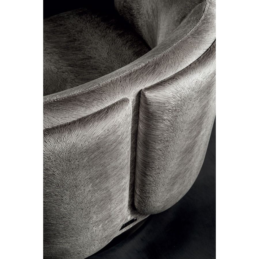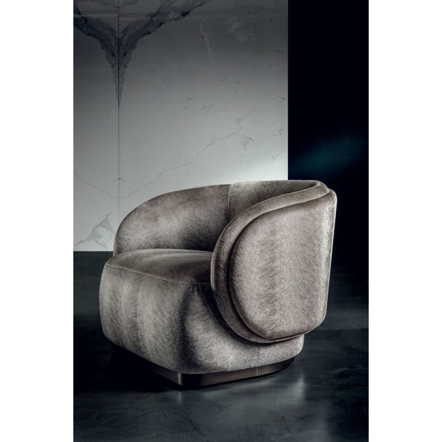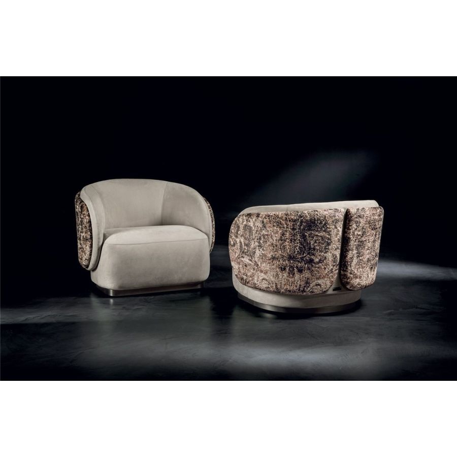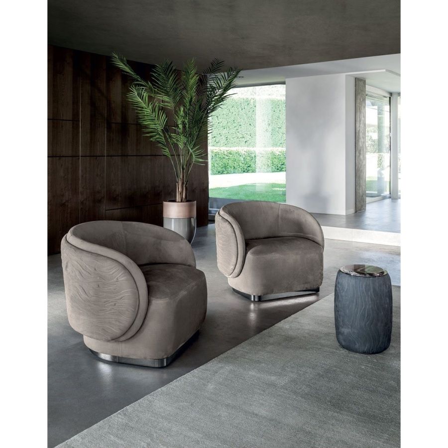 Small armchair with wood structure and elastic bands, covered in high density polyurethane foam. The seat is in triple density polyurethane foam with a cover in polyester bonded with white fabric. The base has a chrome metal ring in the following finishes: Shaded copper, Bright shaded brown, Black Rose gold, bright light gold, Champagne gold, bright chrome, bright black chrome, matt satined bronze. Another important characteristic are the two padded rear wings that seem to embrace the structure. These parts can have a quilted cover with the exclusive “Groove” decoration. Given the particular assembly, the upholstery is not removable.