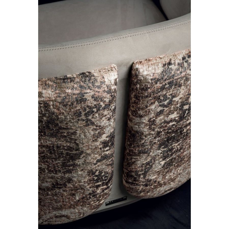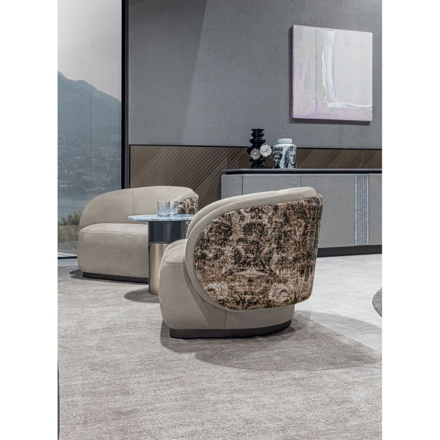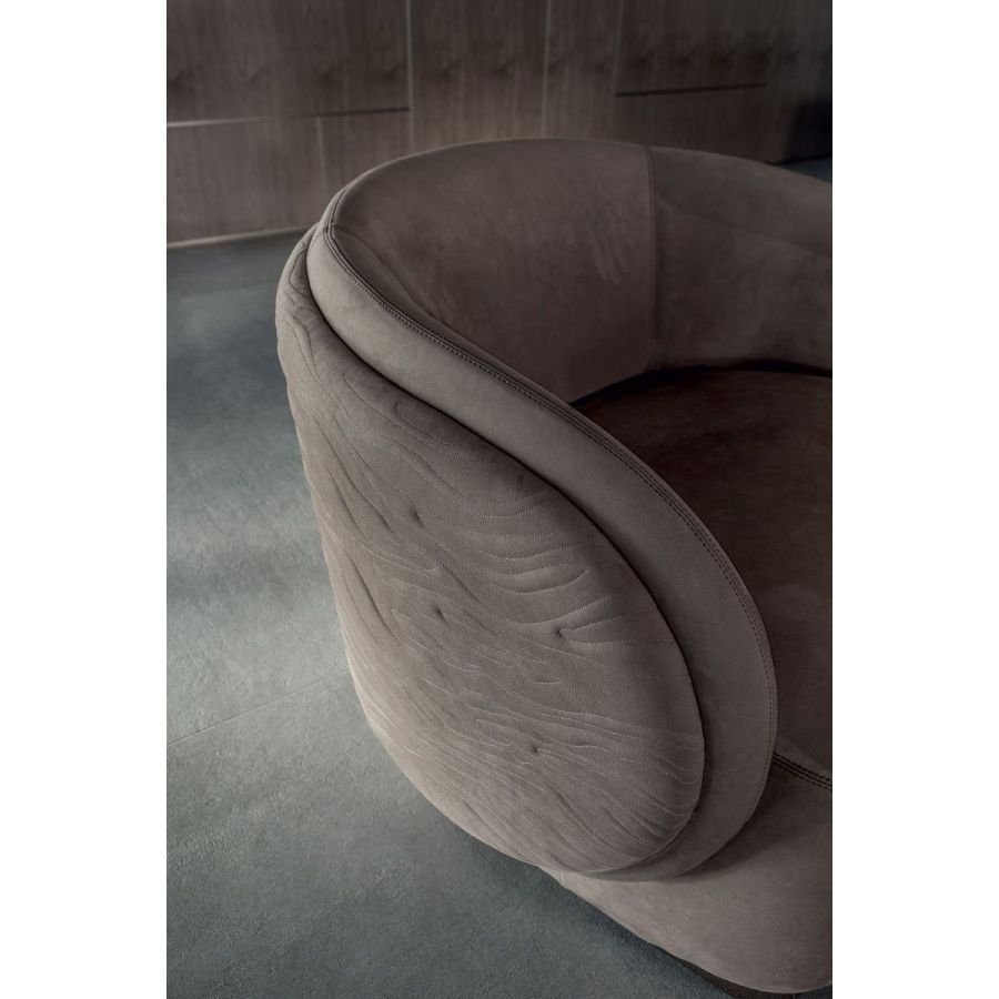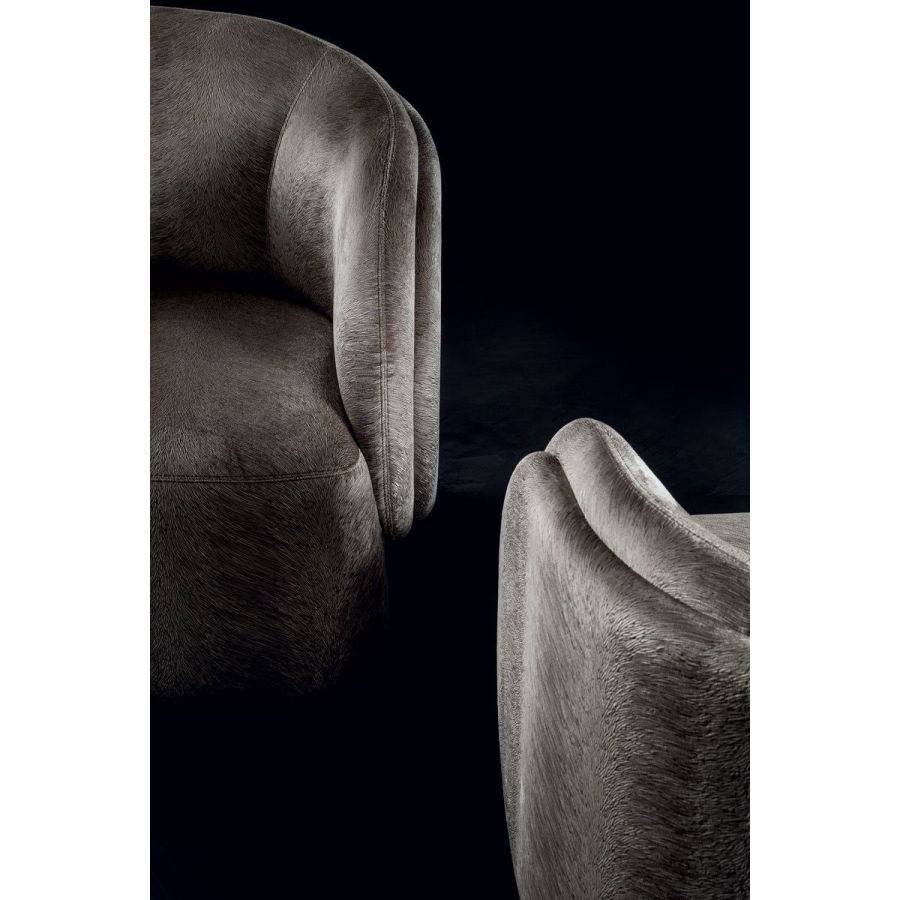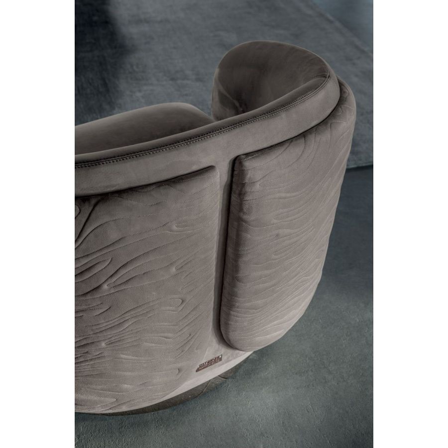 Small armchair with wood structure and elastic bands, covered in high density polyurethane foam. The seat is in triple density polyurethane foam with a cover in polyester bonded with white fabric. The base has a chrome metal ring in the following finishes: Shaded copper, Bright shaded brown, Black Rose gold, bright light gold, Champagne gold, bright chrome, bright black chrome, matt satined bronze. Another important characteristic are the two padded rear wings that seem to embrace the structure. These parts can have a quilted cover with the exclusive “Groove” decoration. Given the particular assembly, the upholstery is not removable.